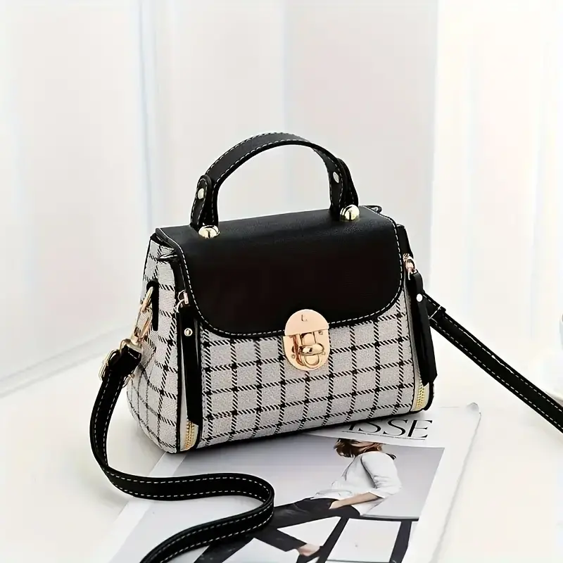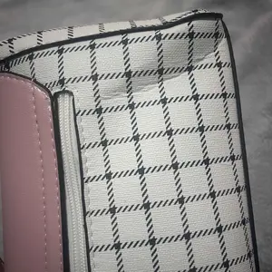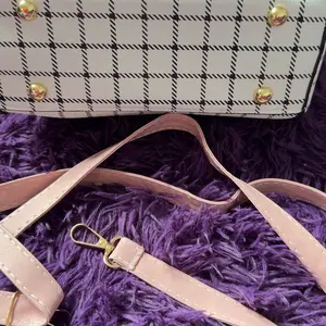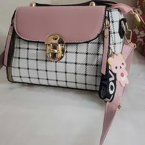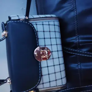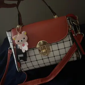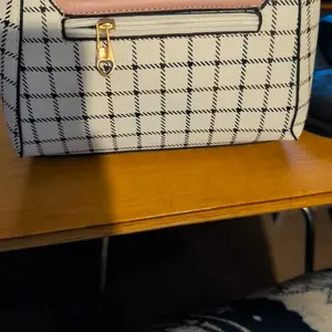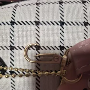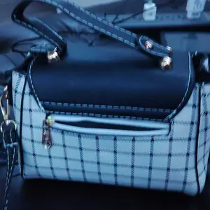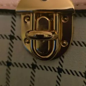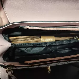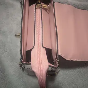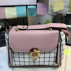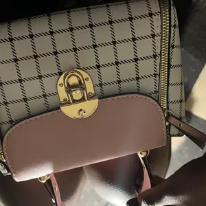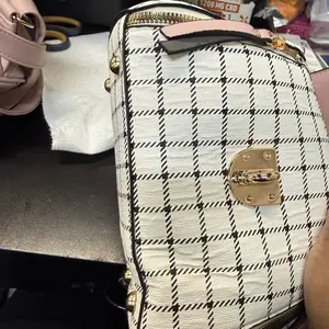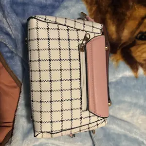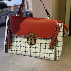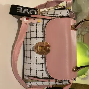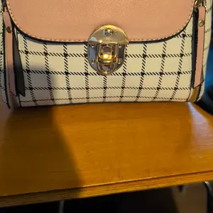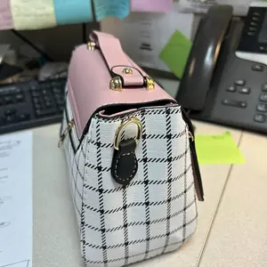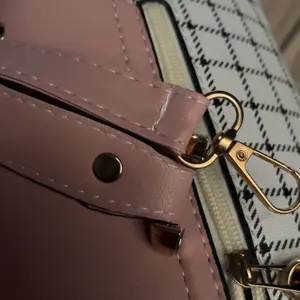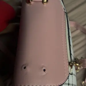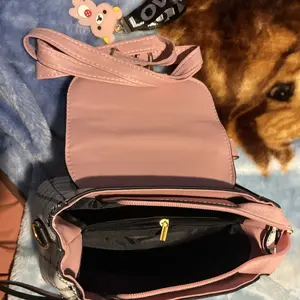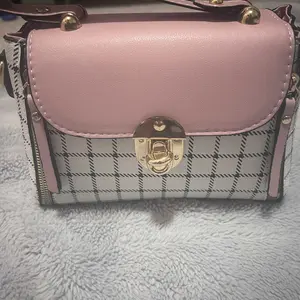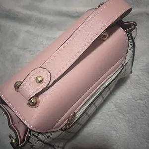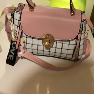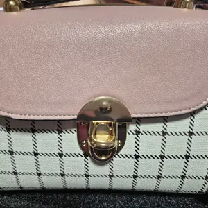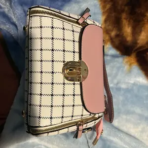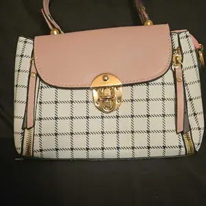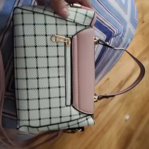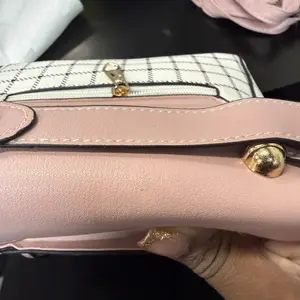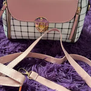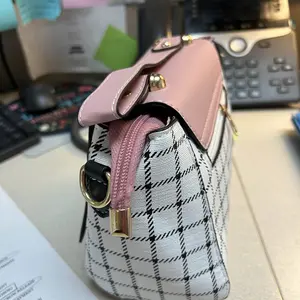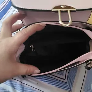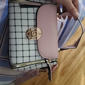 This bag is small but cute! It has a well bled of colors such as pastel pink, white, black! The shoulder belt is pink in pastel. The buckle it’s gold toned where you open the bag. Inside it’s compact. I love the shape and for such a great price! You can’t beat it!
