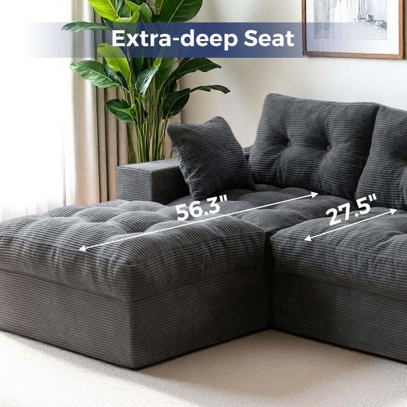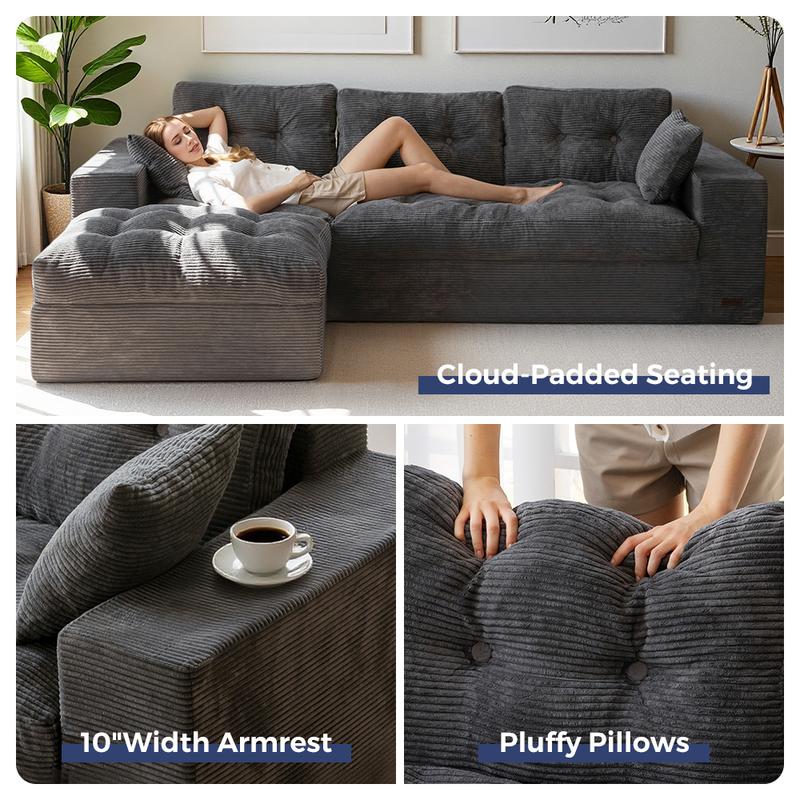 ·Layered Cushioning Construction: Enjoy the perfect balance of softness and support. The modern sectional sofa is supported by a double layer of cushions, with the bottom layer made from full block of high-density foam for a firm structure, while the top layer is made from shredded foam filling to provide cloud-like softness and comfort