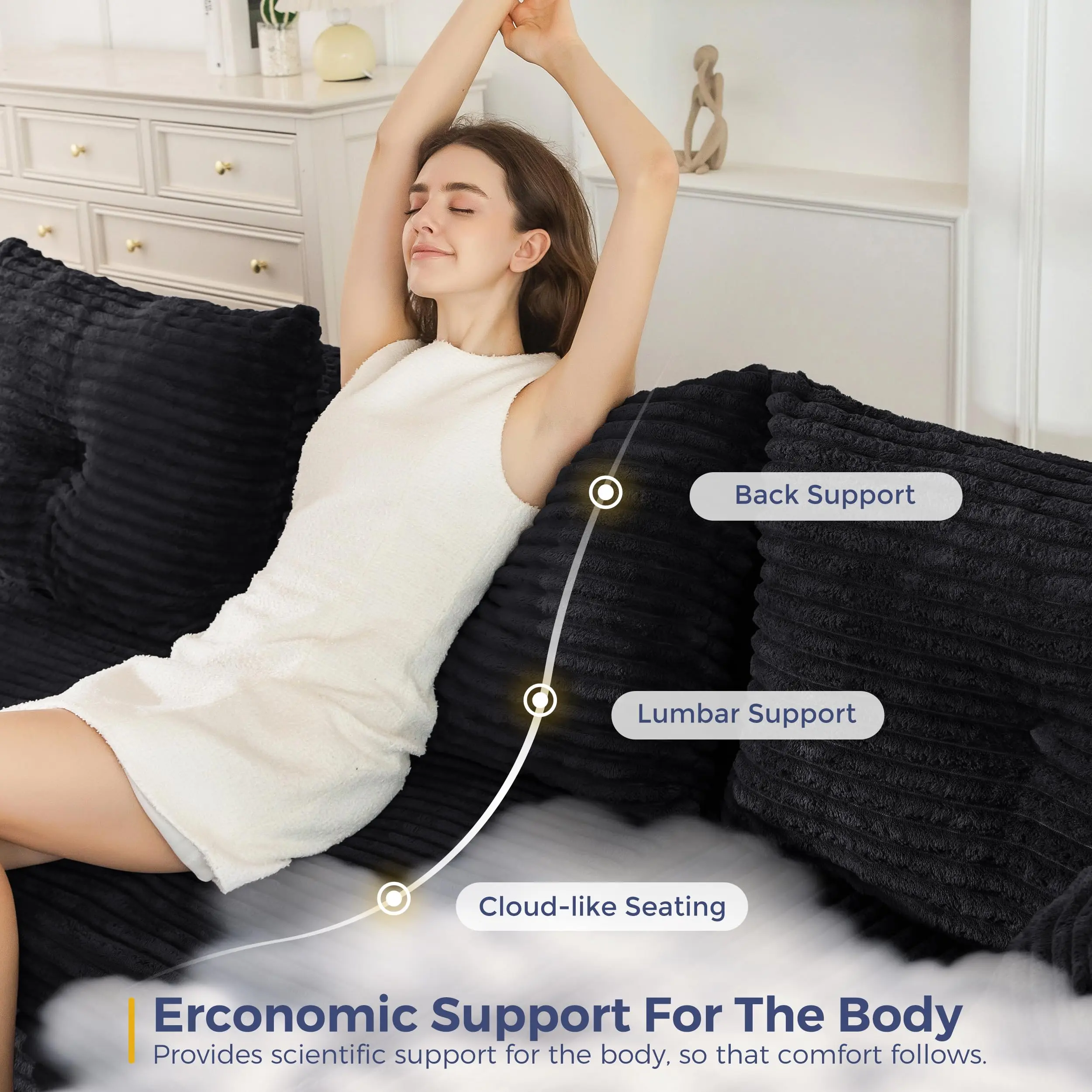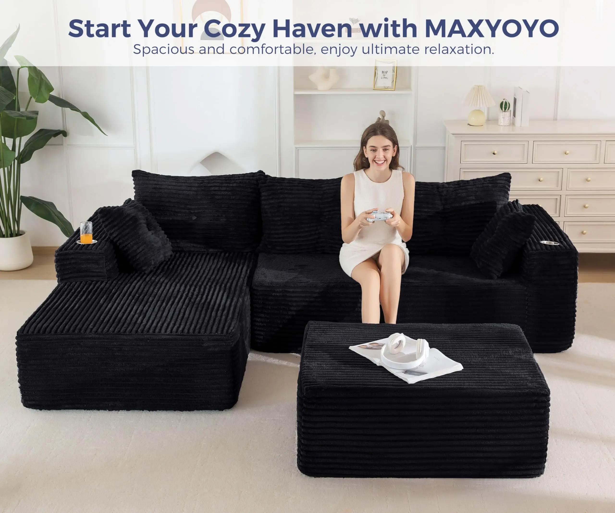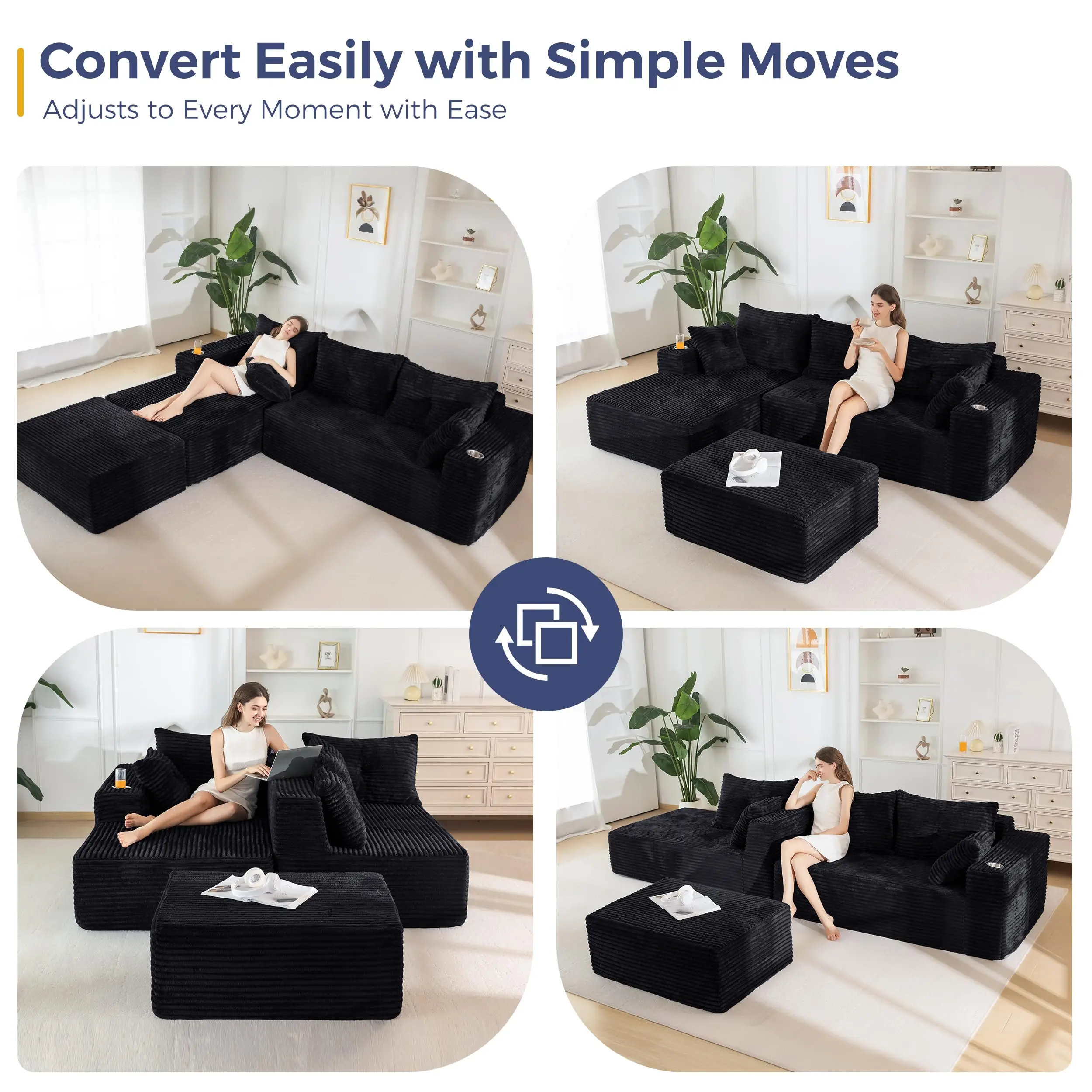 ·Spacious U-Shaped Comfort: Generously sized with a deep, enveloping U layout, this modular sofa provides ample space for the whole family to lounge together. Stretch out, curl up, or lie down — perfect for entertaining guests or enjoying an afternoon nap. The oversized design brings a luxurious sense of scale and relaxation to your living room