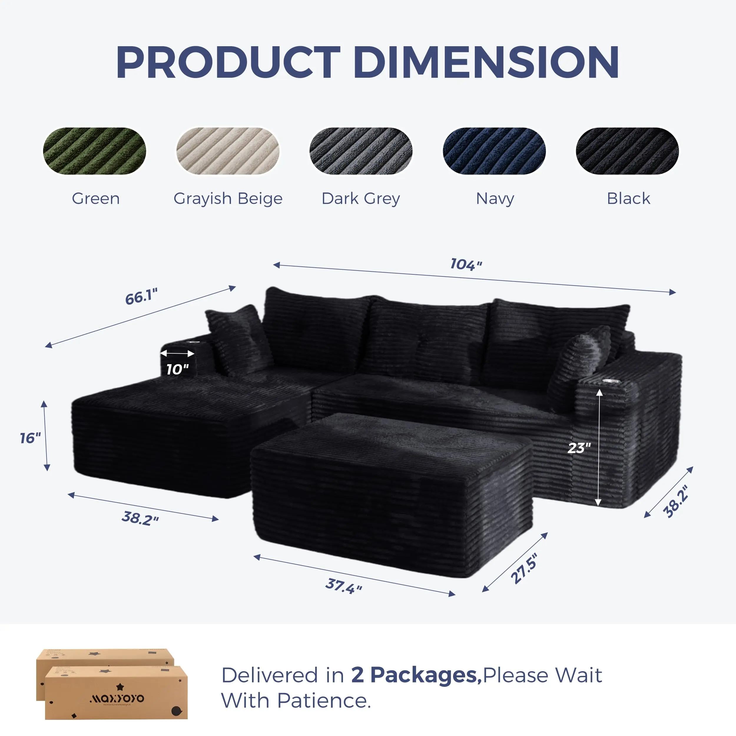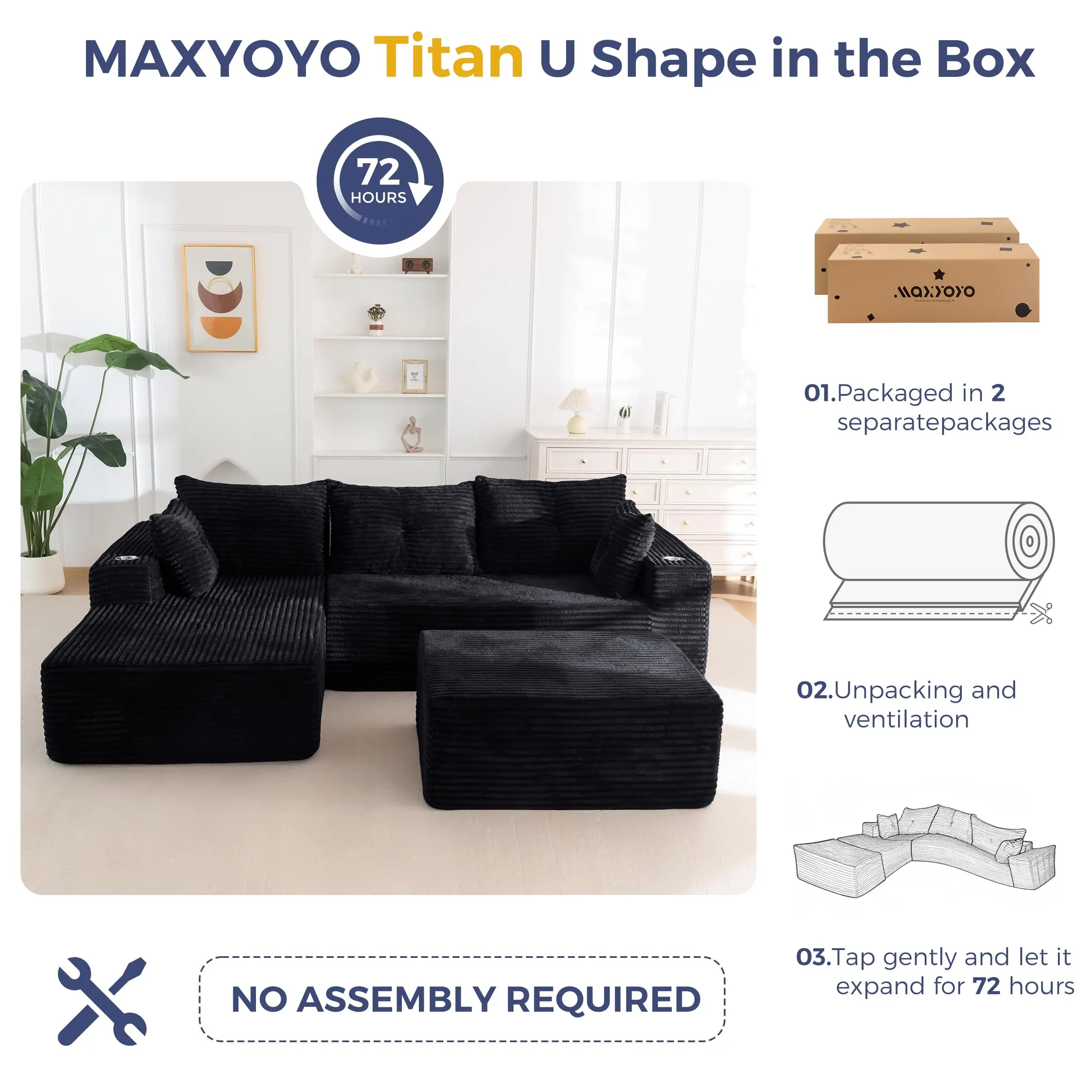 ·No Assembly Required: The U-shape sofa is divided into 2 packages, may not arrive at the same time. Please be patient and wait for all your packages. No assembly required, after opening the package, place it in a ventilated and dry environment, wait for about 72 hours or so to be able to return to its original shape, meanwhile, gently pat each part to improve its elasticity and luster, you can enjoy a comfortable experience!