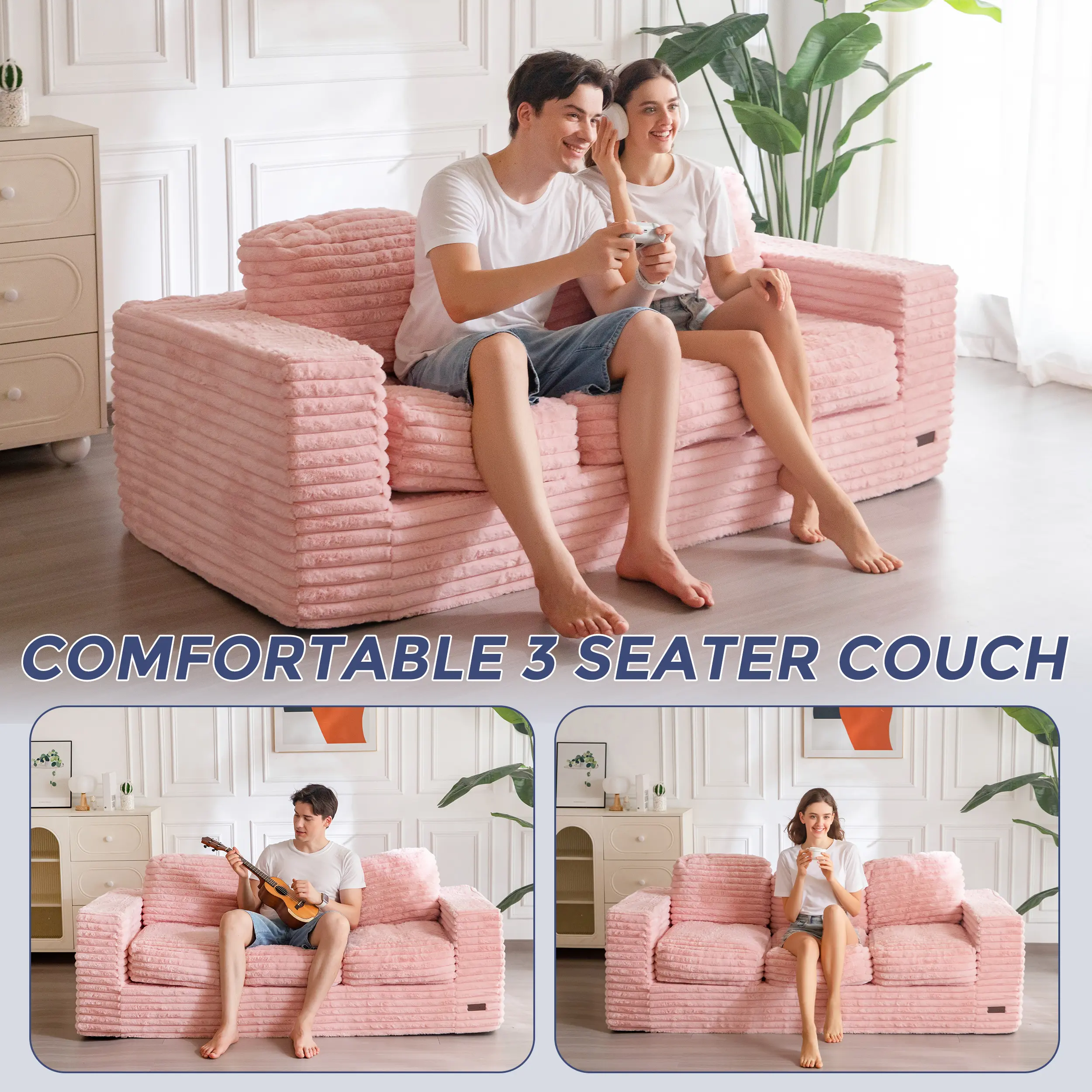 Generously sized for relaxation, this 3-seater sofa offers ample room to stretch out or snuggle up. Its boneless structure ensures a soft, cloud-like feel that hugs your body — ideal for reading, chatting, or simply unwinding after a long day.
