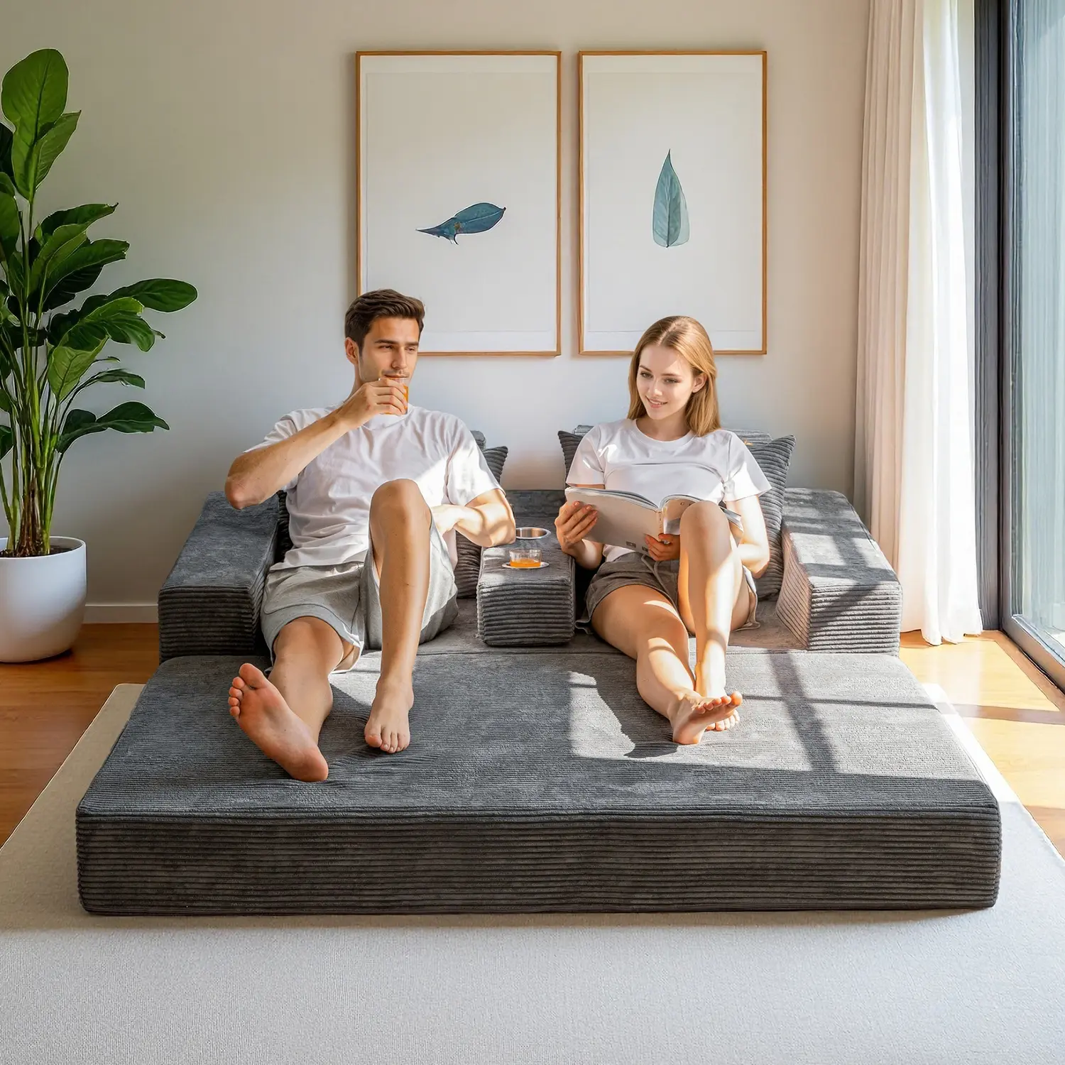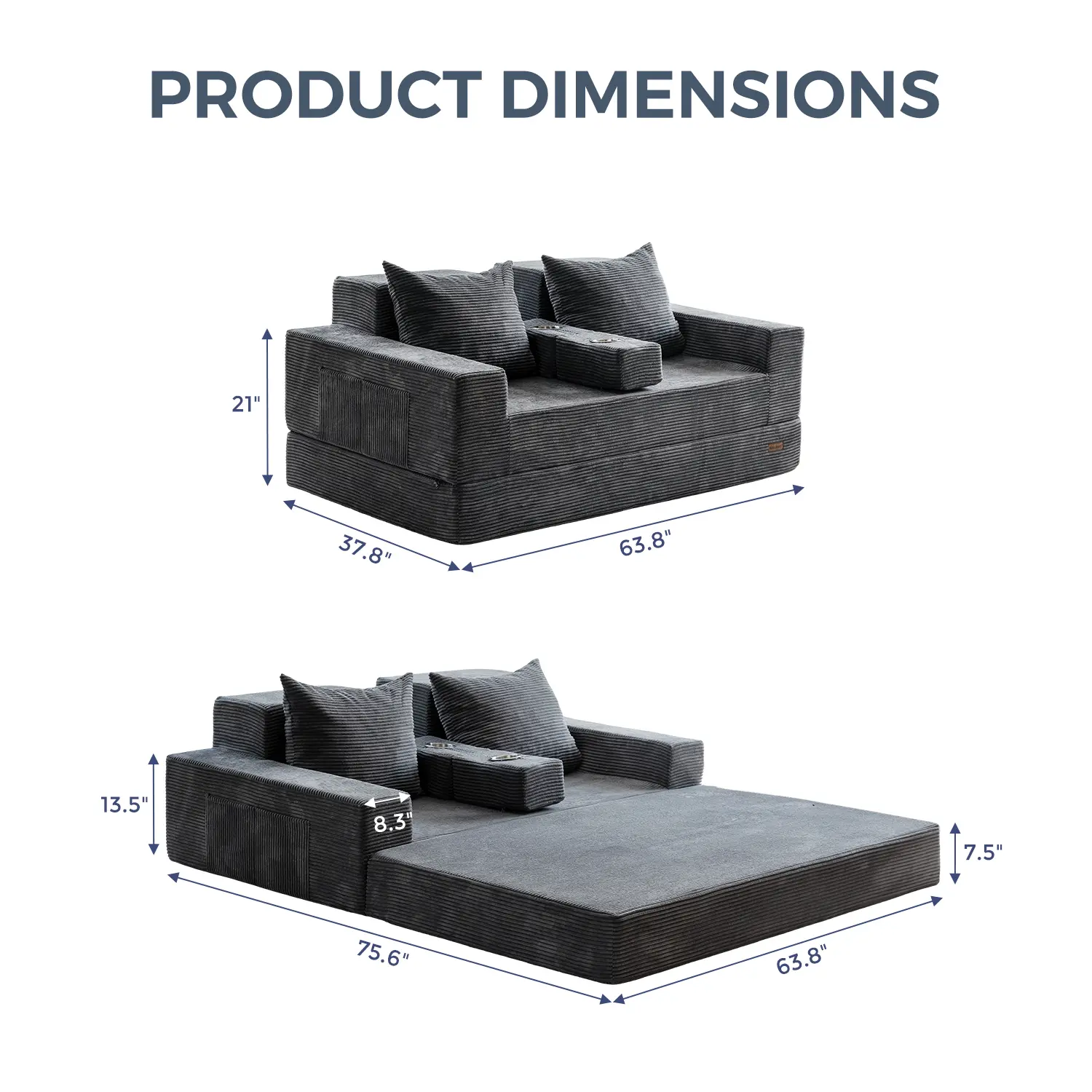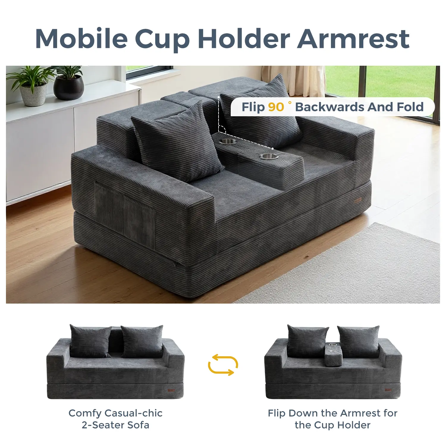 Easily folds into a floor sofa, lounger, sleeper bed, or sofa with cup holders. Perfect for small apartments, dorms, or guest rooms.