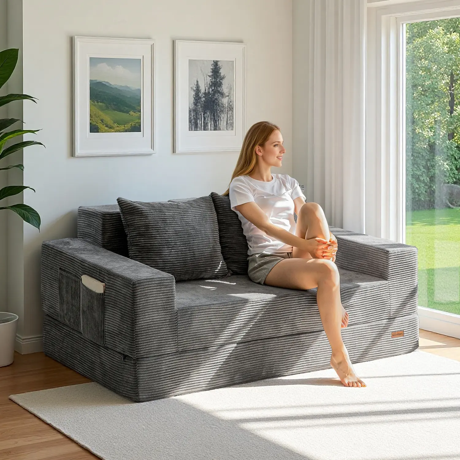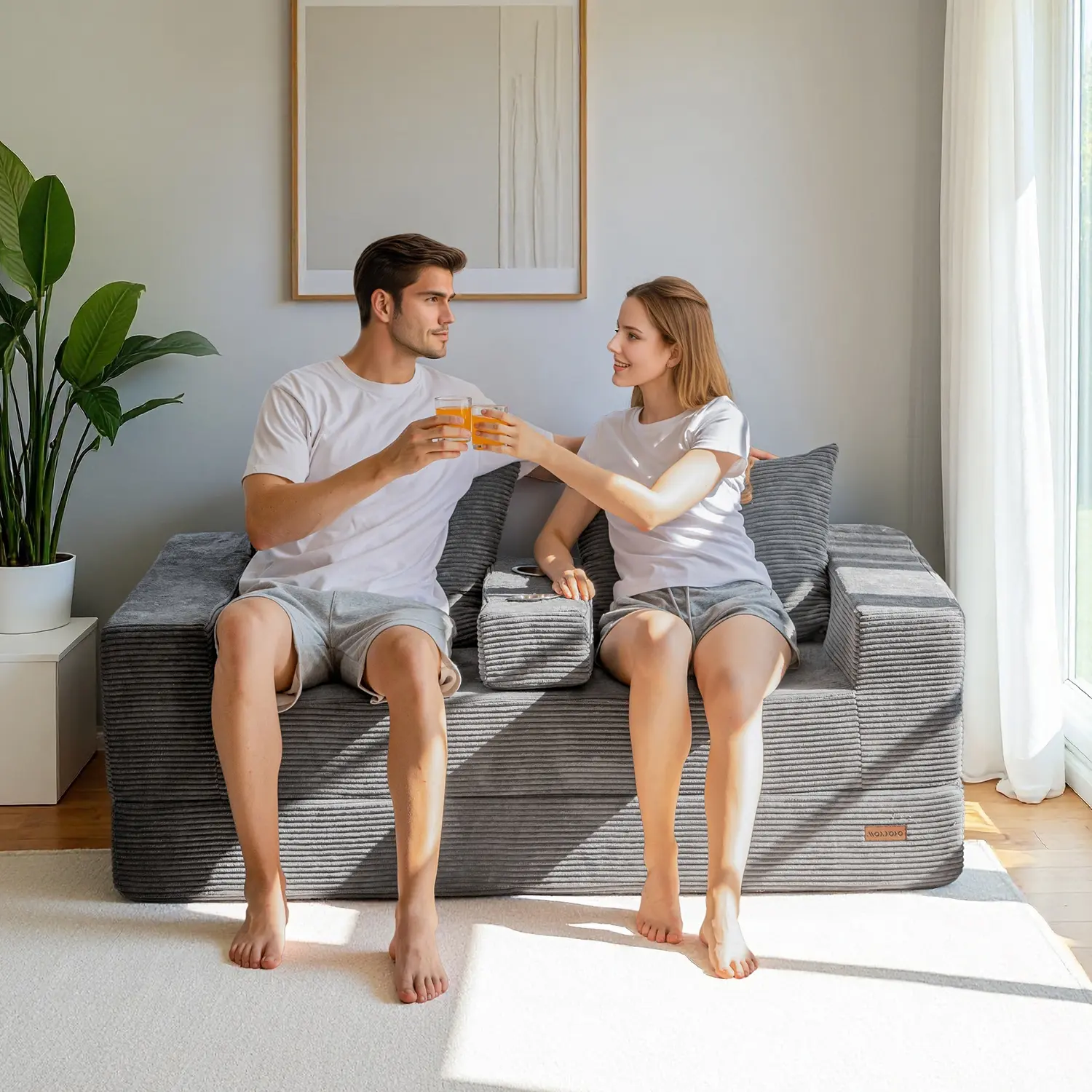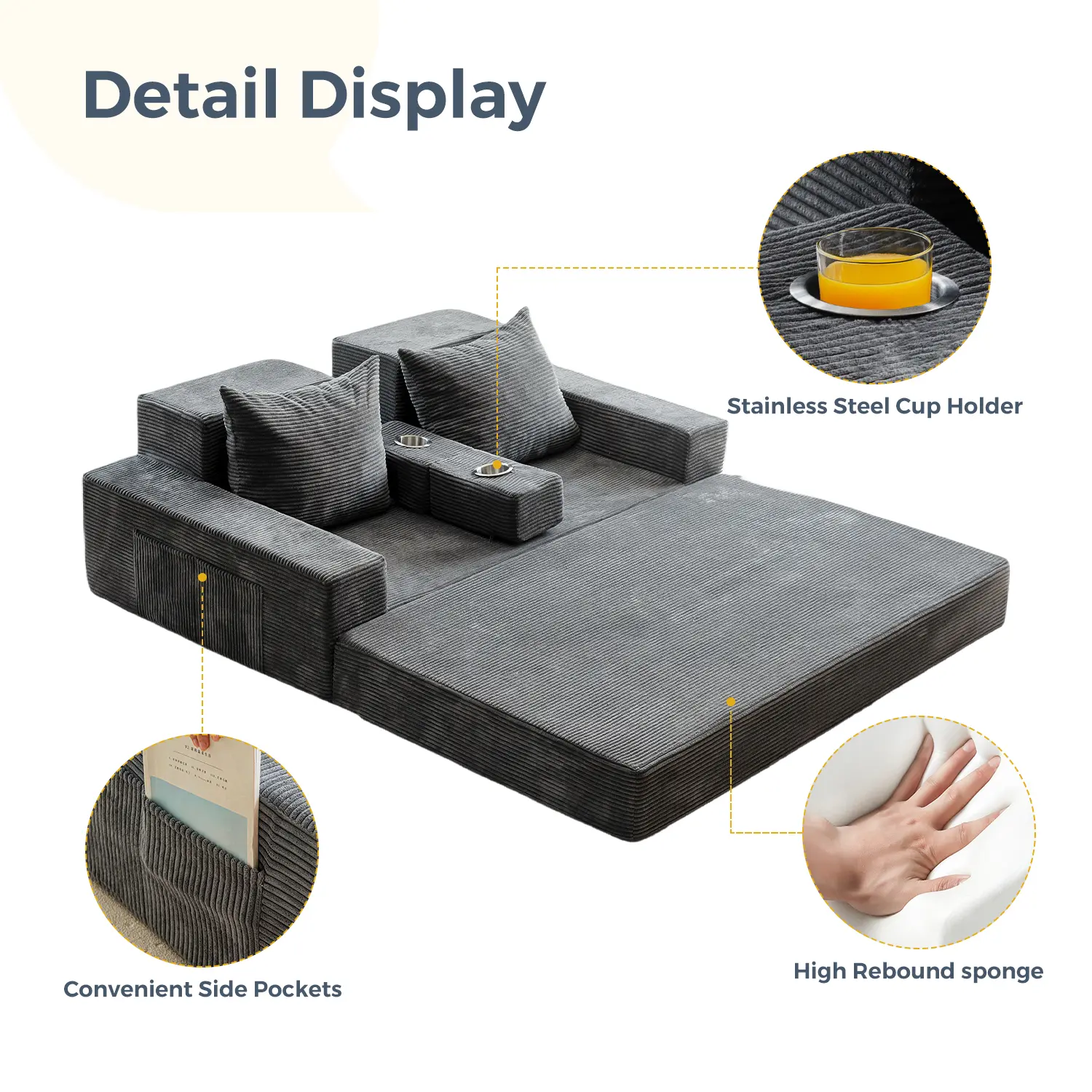 Easily folds into a floor sofa, lounger, sleeper bed, or sofa with cup holders. Perfect for small apartments, dorms, or guest rooms.