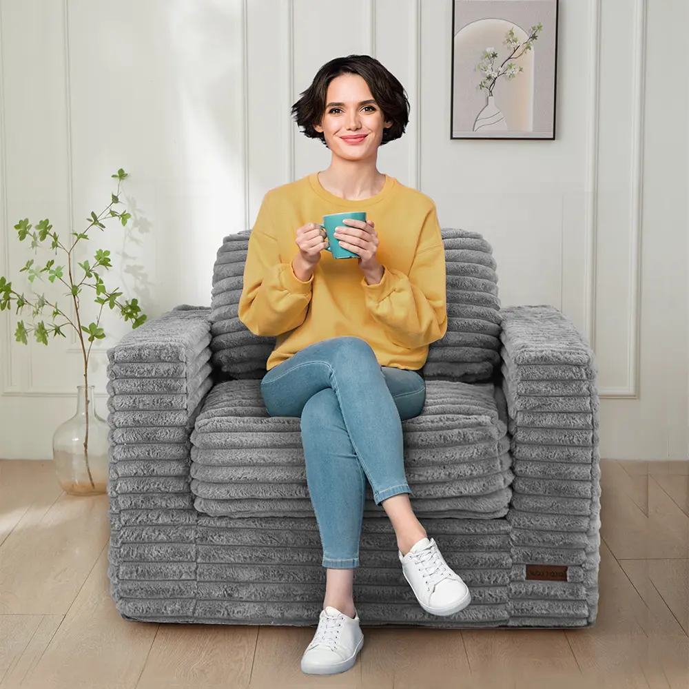 Sophisticated Grey Fabric with Practical Features: The elegant grey faux fur is not only soft to the touch but also designed for real life. The zippered cover is removable and machine-washable, and the sturdy anti-skid base ensures your lazy sofa stays safely in place.