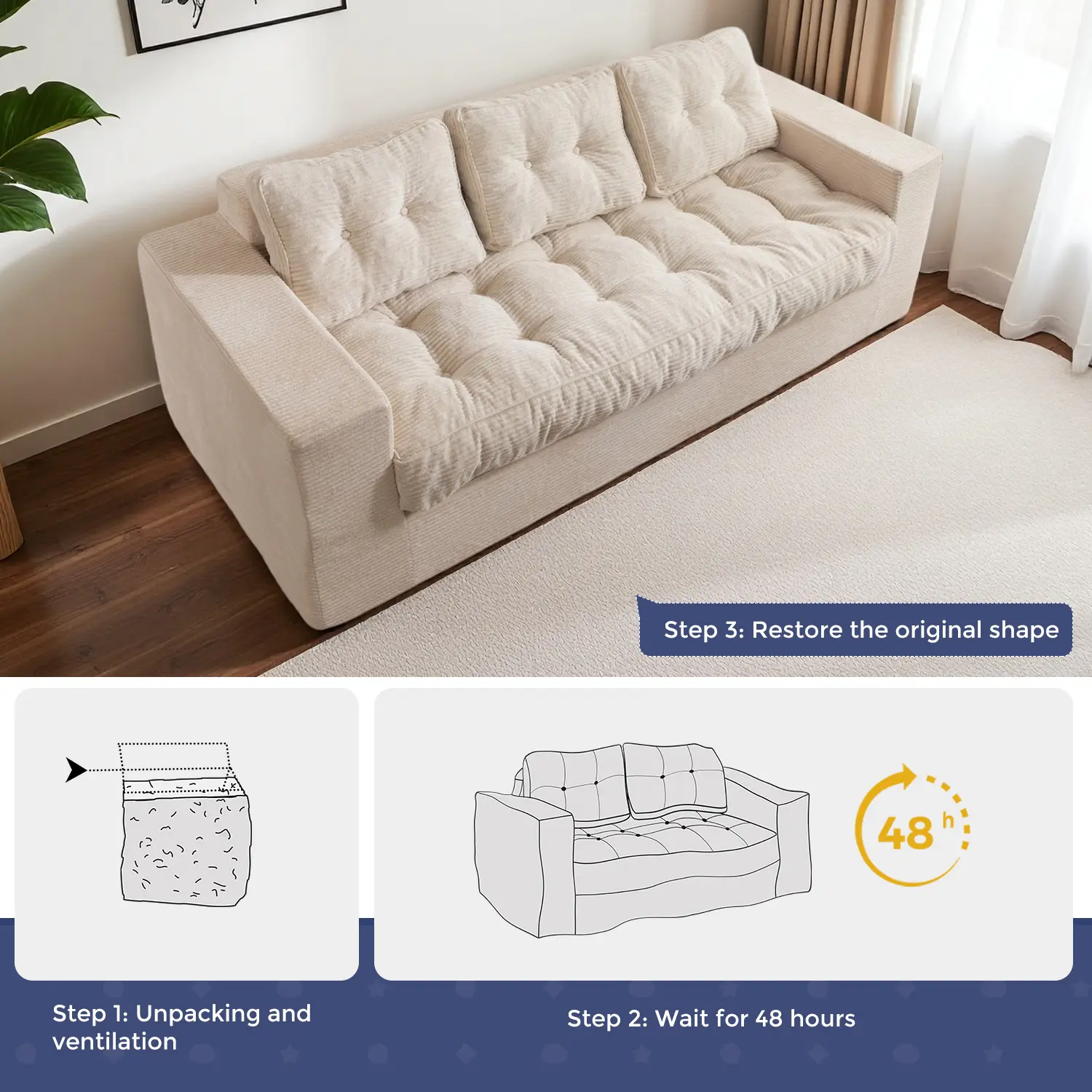 No Assembly Required: Forget about complicated setup! Simply open the package, place it in a ventilated and dry environment, wait for about 48 hours or so to be able to return to its original shape, meanwhile, gently pat each part to improve its elasticity and luster, you can enjoy a comfortable experience!