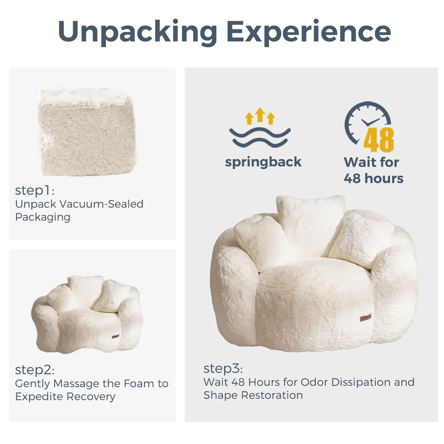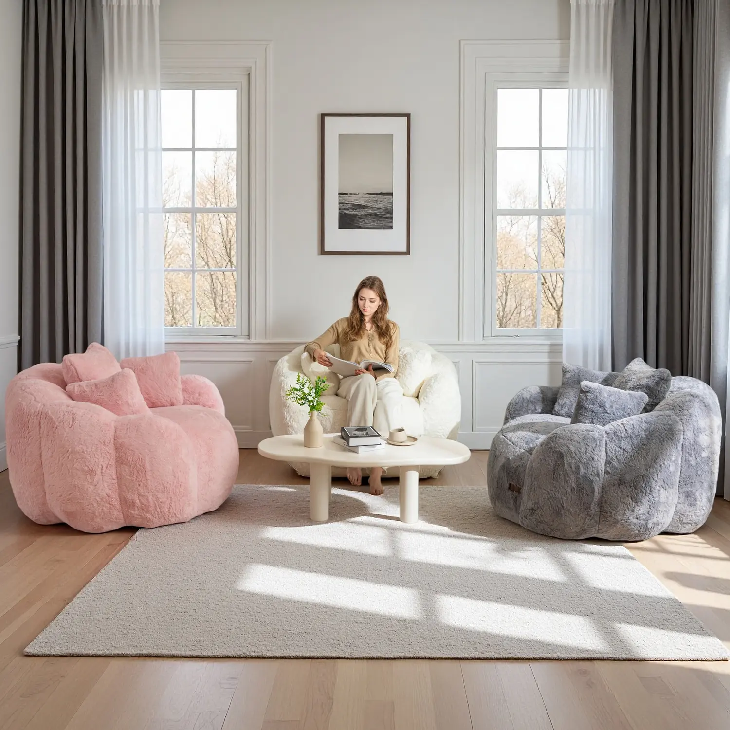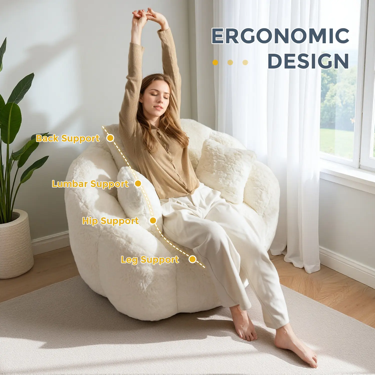 ️ Floral Backrest Design – Curved petal-like shape brings elegance & support to any space ️ Includes 3 Functional Pillows – Use as backrest, armrest or hug cushion while lounging or reading ️ Ultra-Soft Faux Fur – Thick, buttery faux fur feels cloud-like and looks luxurious ️ Supportive Filling – High-density shredded foam conforms to your body while maintaining shape ️ Versatile & Cozy – Perfect for bedroom, living room, reading corner, balcony, or game room ️ No Assembly Needed – Pre-filled, just open & let it fluff up in 48 hours