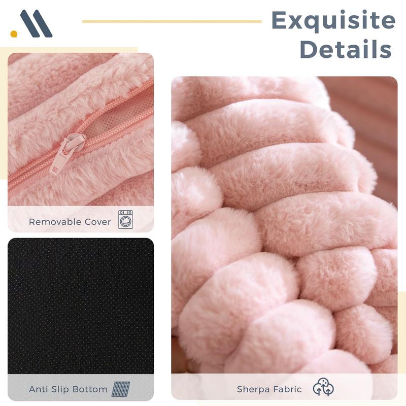 Ultra-soft plush faux fur with a modern wide-stripe pattern. Removable & machine washable cover + anti-slip bottom for added stability.