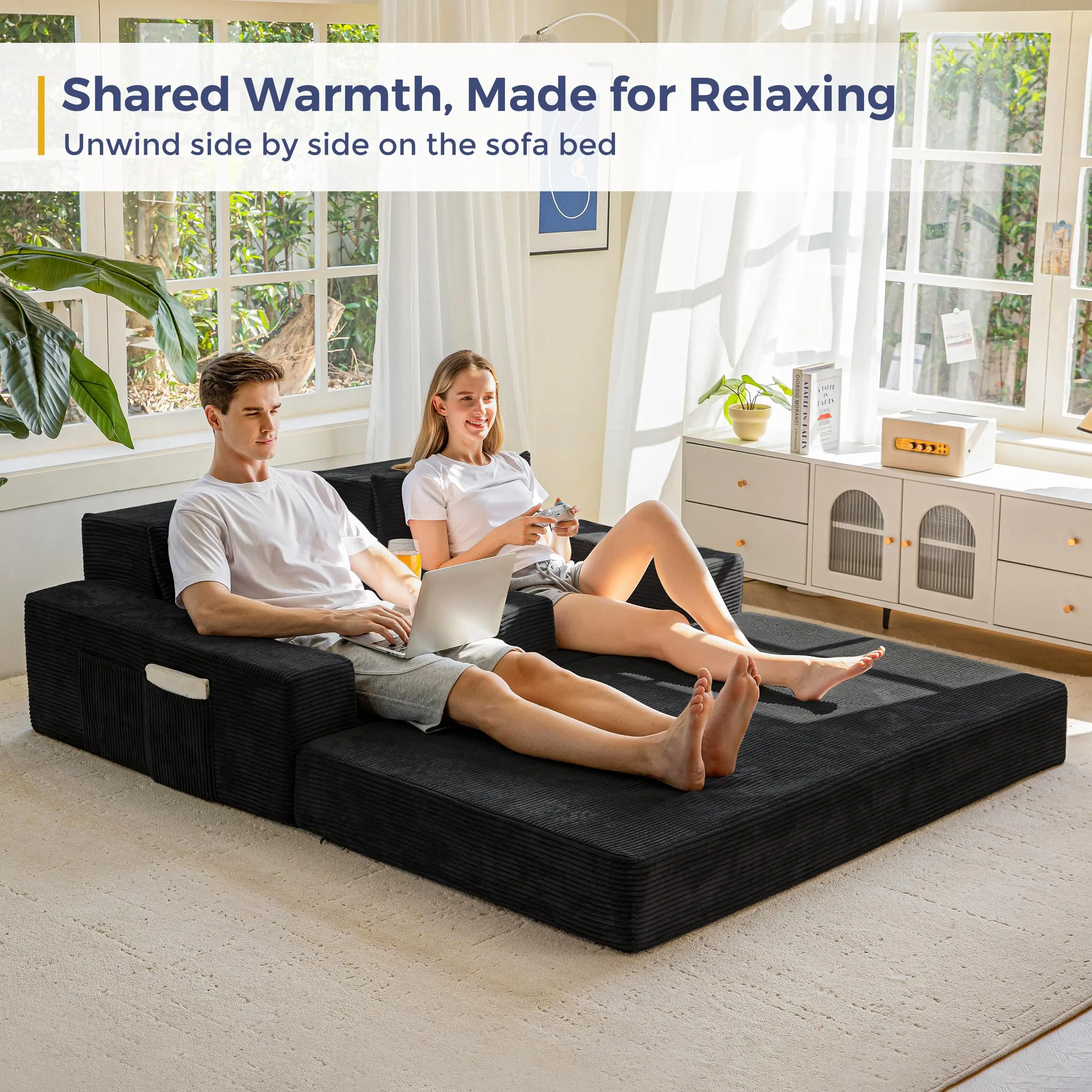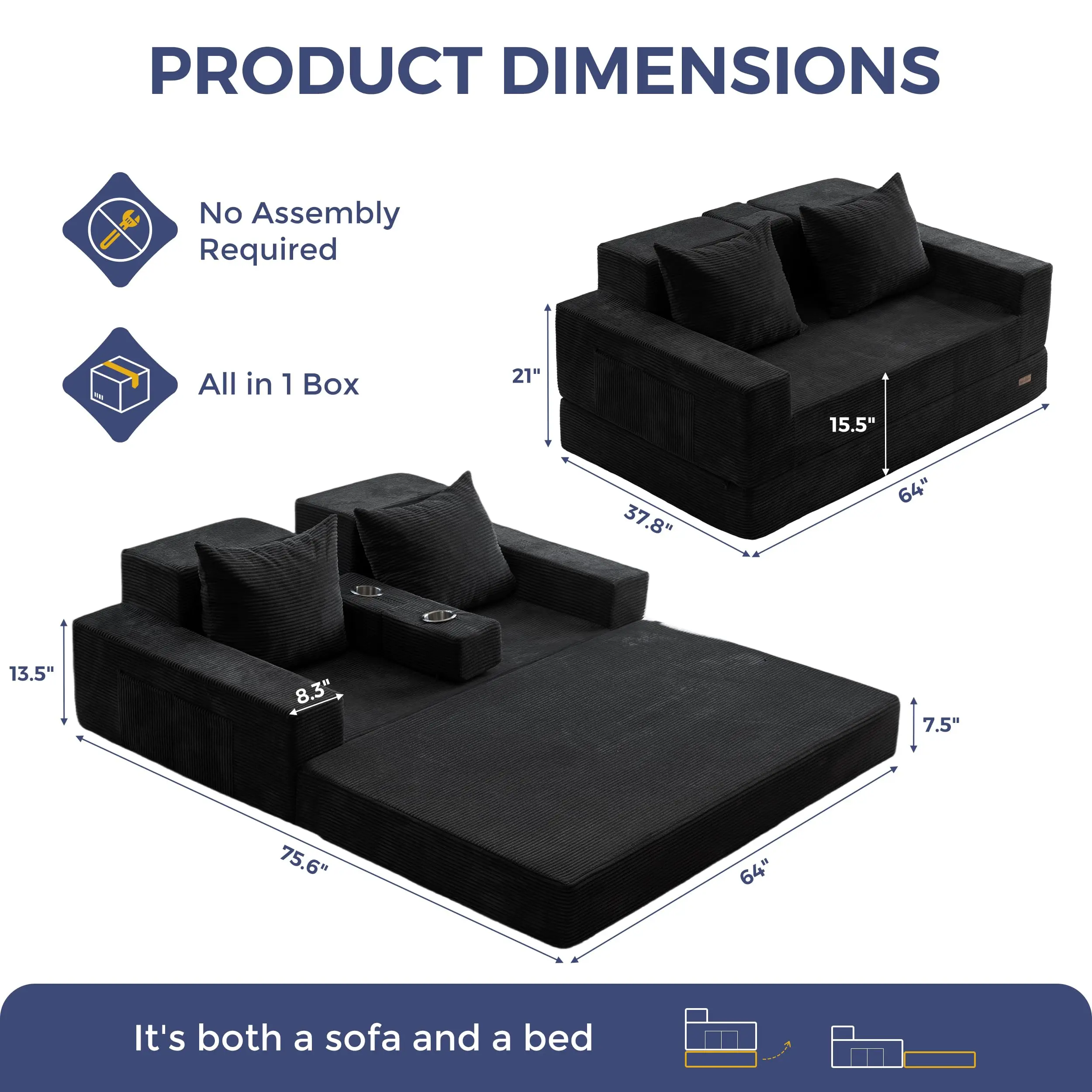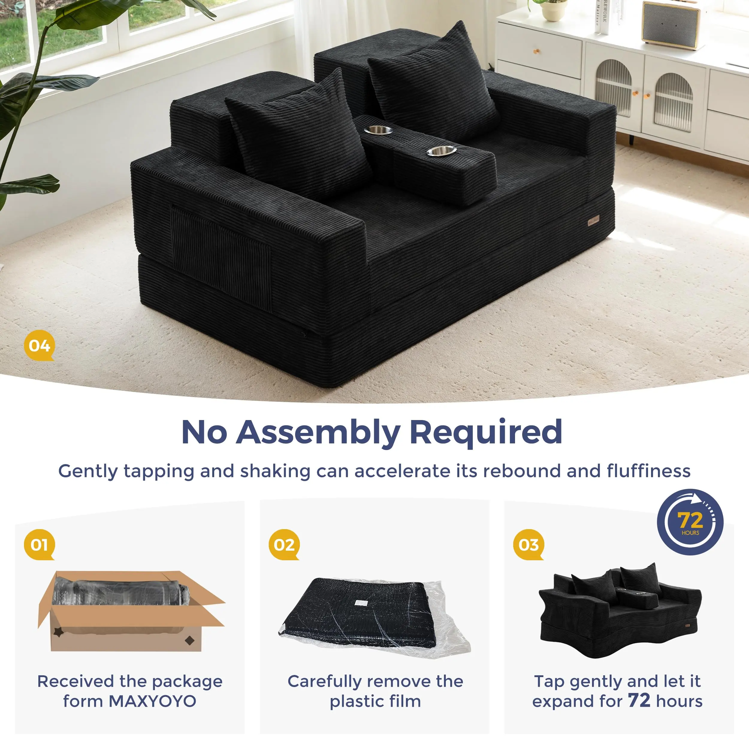 ·4 in 1 Foldable Sofa Bed: This versatile sofa couch easily folds out into a floor sofa bed, giving you flexible seating and sleeping options. It can serve as sofa, sofa with cup holders, sofa bed, and sofa bed with cup holders. Perfect for small spaces, apartments, dorms, or guest rooms.
