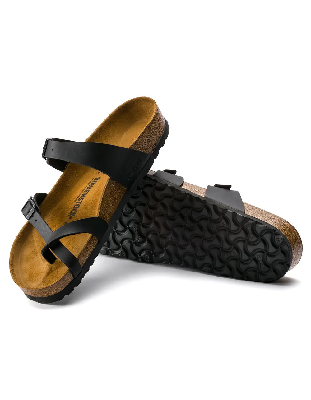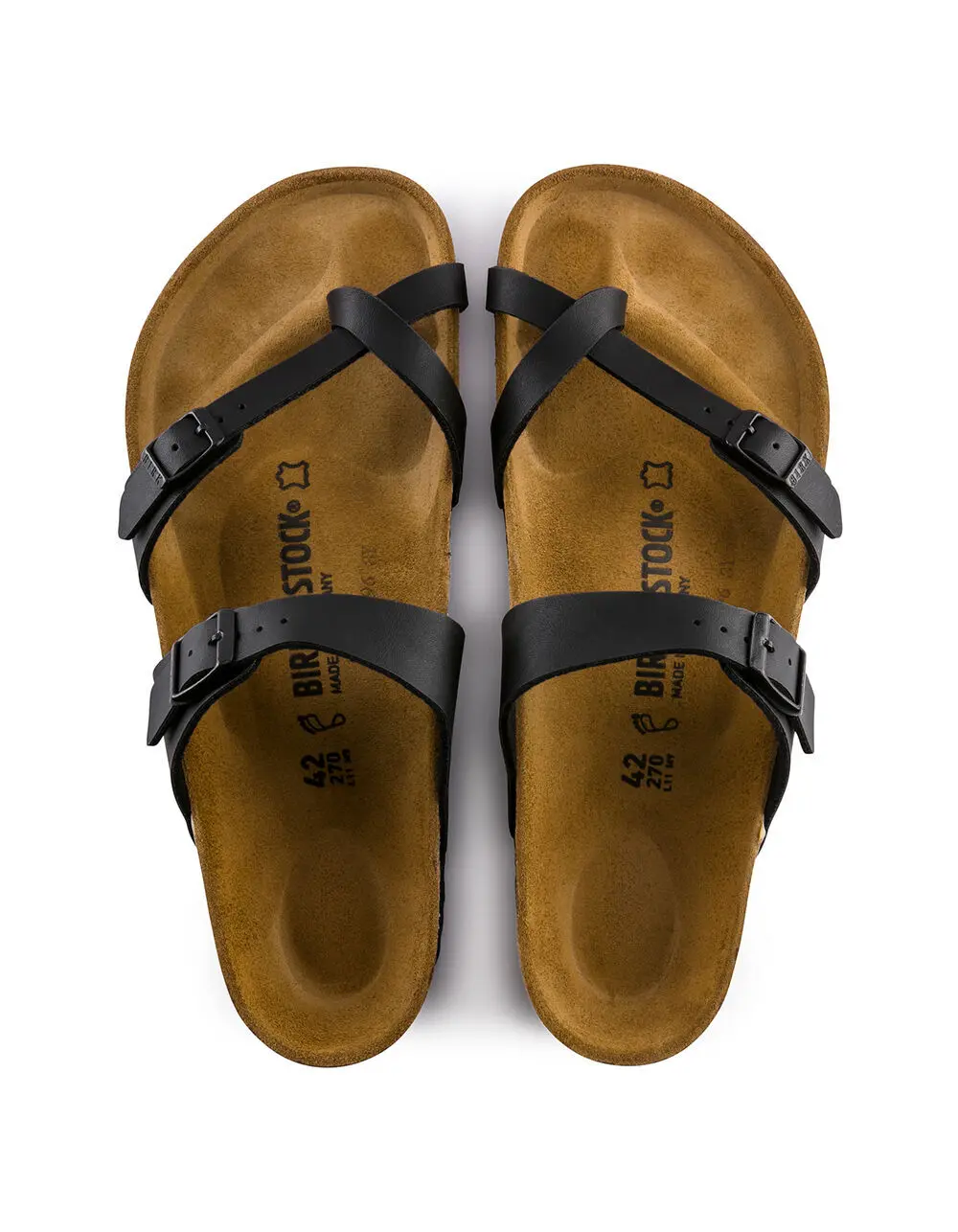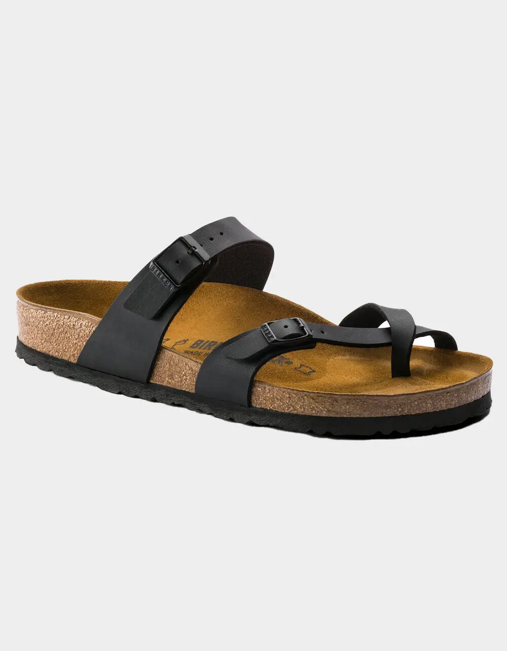 Birkenstock Mayari Sandals. The Mayari from BIRKENSTOCK - an elegantly comfortable sandal with adjustable, crisscrossing straps that form a single loop around the toe. Classic support and adjustability, designed beautifully. Shown in Birko-Flor ® .-Regular width-Anatomically shaped cork-latex footbed-Upper: Birko-Flor ® -Footbed lining: suede-Sole: EVA-Details: two straps, each with an individually adjustable metal pin buckle; toe loop-Imported