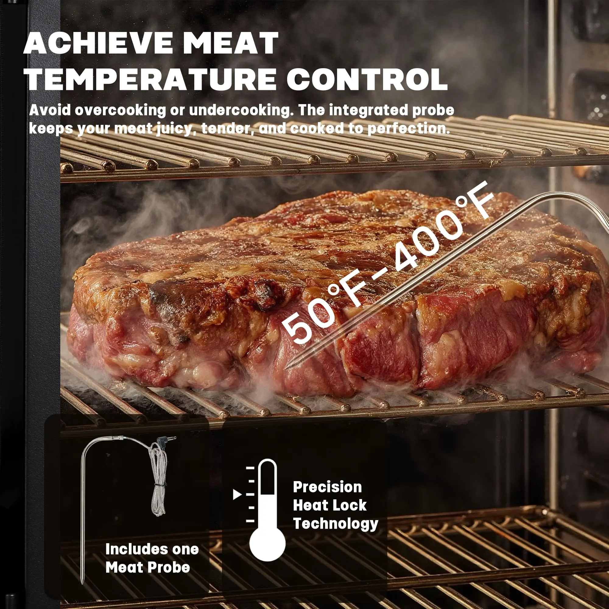 • Built-in Meat Probe with Beep Notification (50°F–250°F): Monitor internal food temperature in real-time. A built-in alert beeps when your set temperature is reached, preventing overcooking or undercooking.