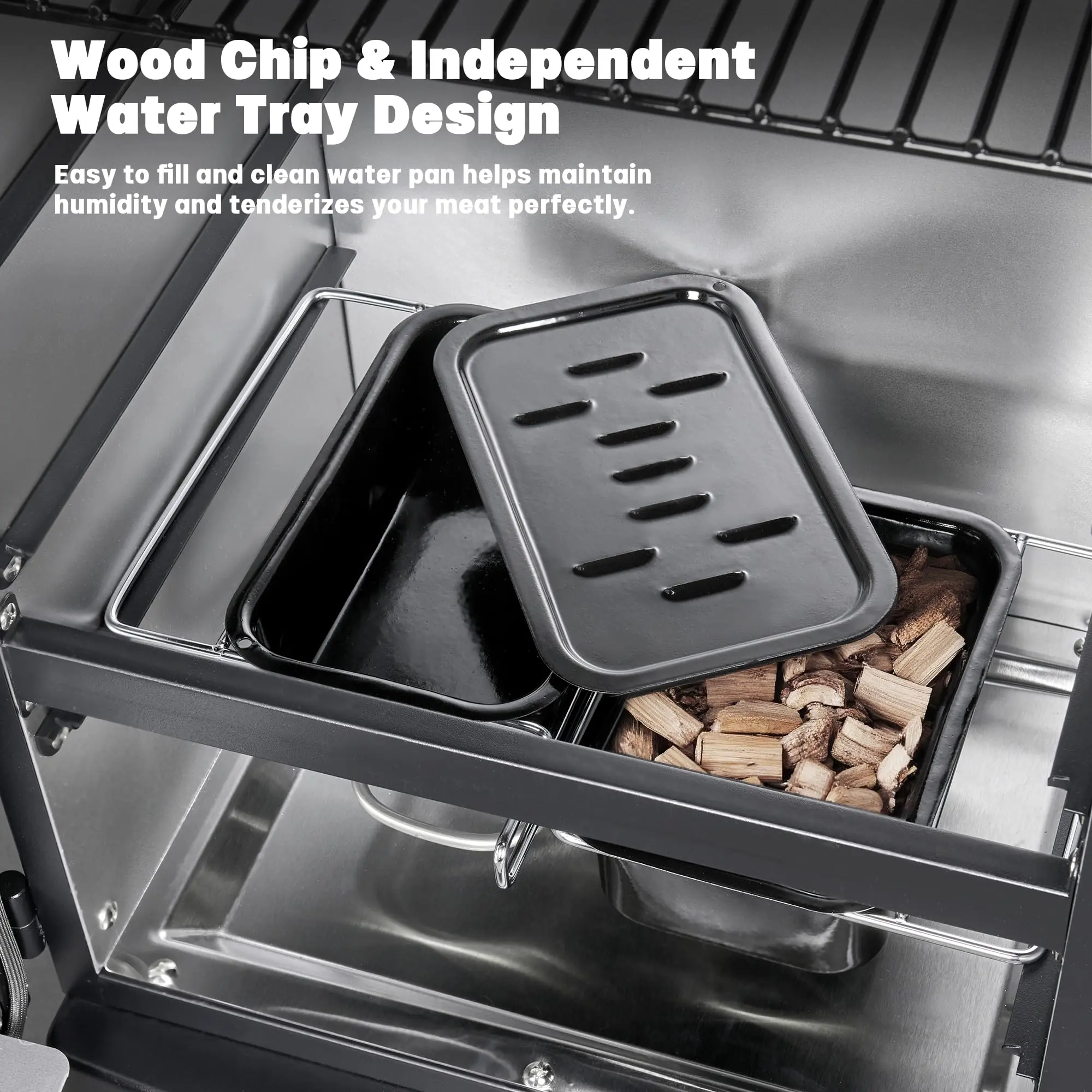 • Side Pull-Out Grease Tray for Easy Cleanup: The side-mounted grease tray slides out effortlessly to collect drippings. Post-cooking cleanup is simple and mess-free.