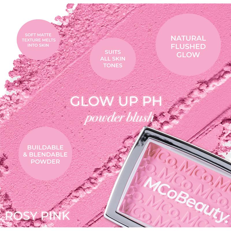 MCoBeauty GLOW UP pH POWDER BLUSH offers a personalized rosy flush. It blends into a custom shade, enhancing complexion for a perfect rosy hue. The smooth, matte texture melts seamlessly onto your cheeks, creating a subtle, cloud-like kiss of color. Watch it develop into an ultra-natural glow. Available in multiple shades, it suits various skin tones.