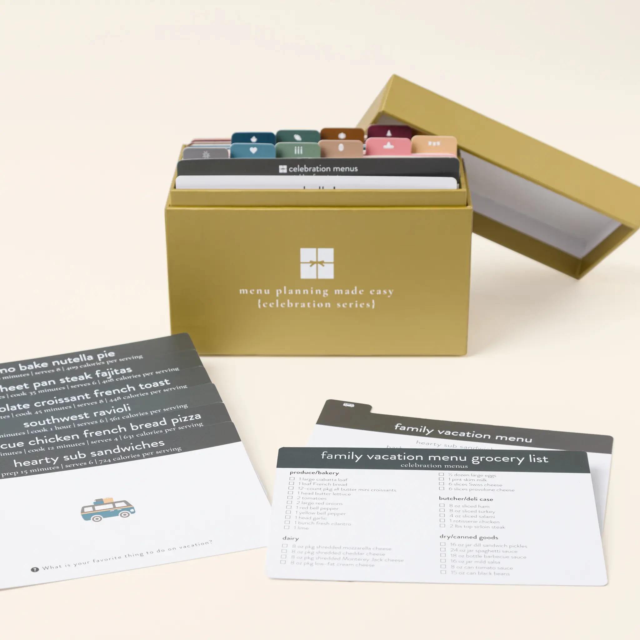 Choose from 3 unique PPP menu plan options: Celebration, or Summer. Each box includes 72 recipes, 12 weeks/themes, and grocery shopping lists. The shopping list is a dry-erase card, reusable for convenience. Helpful tips make meal prep, shopping, cooking, and cleanup quick and easy.