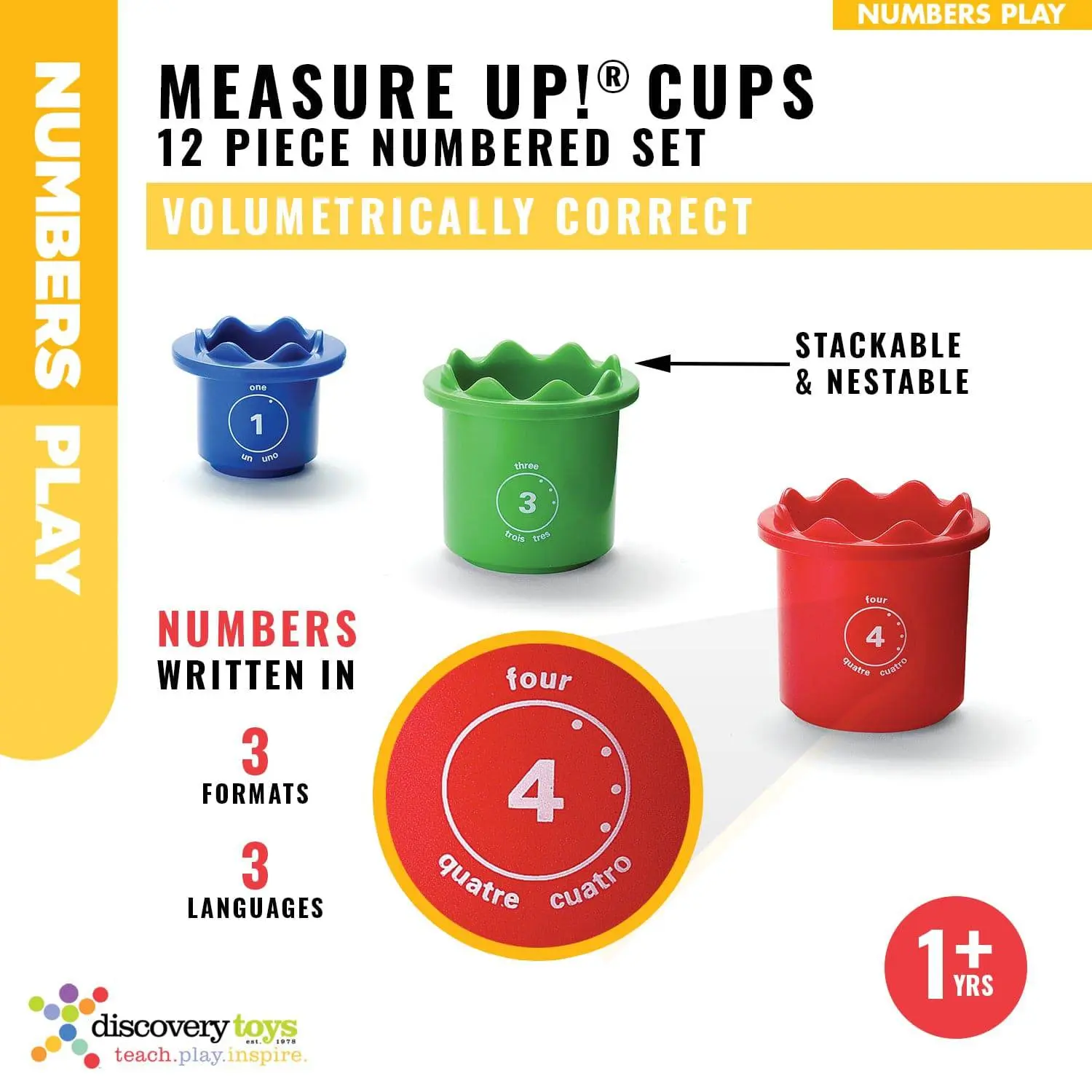 These 12 stackable & nestable cups are uniquely designed to deliver a surprising load of creative and pre-math benefits. Cups are volumetrically correct & sequentially sized for interaction. Volumes can be added or subtracted. For example, Cup #1 + Cup #3 = Cup #4. Fill & dump, stack & nest, match & sort, mold & stamp, and more. English and French activity guides included, introducing a host of fundamental concepts related to counting, sorting, volume, size, patterns, measurement, clock time & more. Numbers printed on front in 3 formats & matching raised numbers molded on inside. Sequentially sized animals molded on bottom of cups for dough play. Colors may vary. dt exclusive.