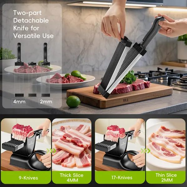 Multiple Blades - Up to 17 blades can be installed, cutting a whole block of fresh meat into 18 thin slices.