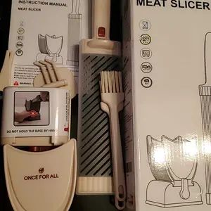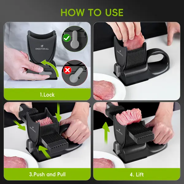 The ONCE FOR ALL food slicer is a versatile tool for home use, enhancing the taste and nutrition of your dishes with fresh meat. It offers secure tabletop attachment, multiple blade options, and easy cleaning for a hassle-free experience.