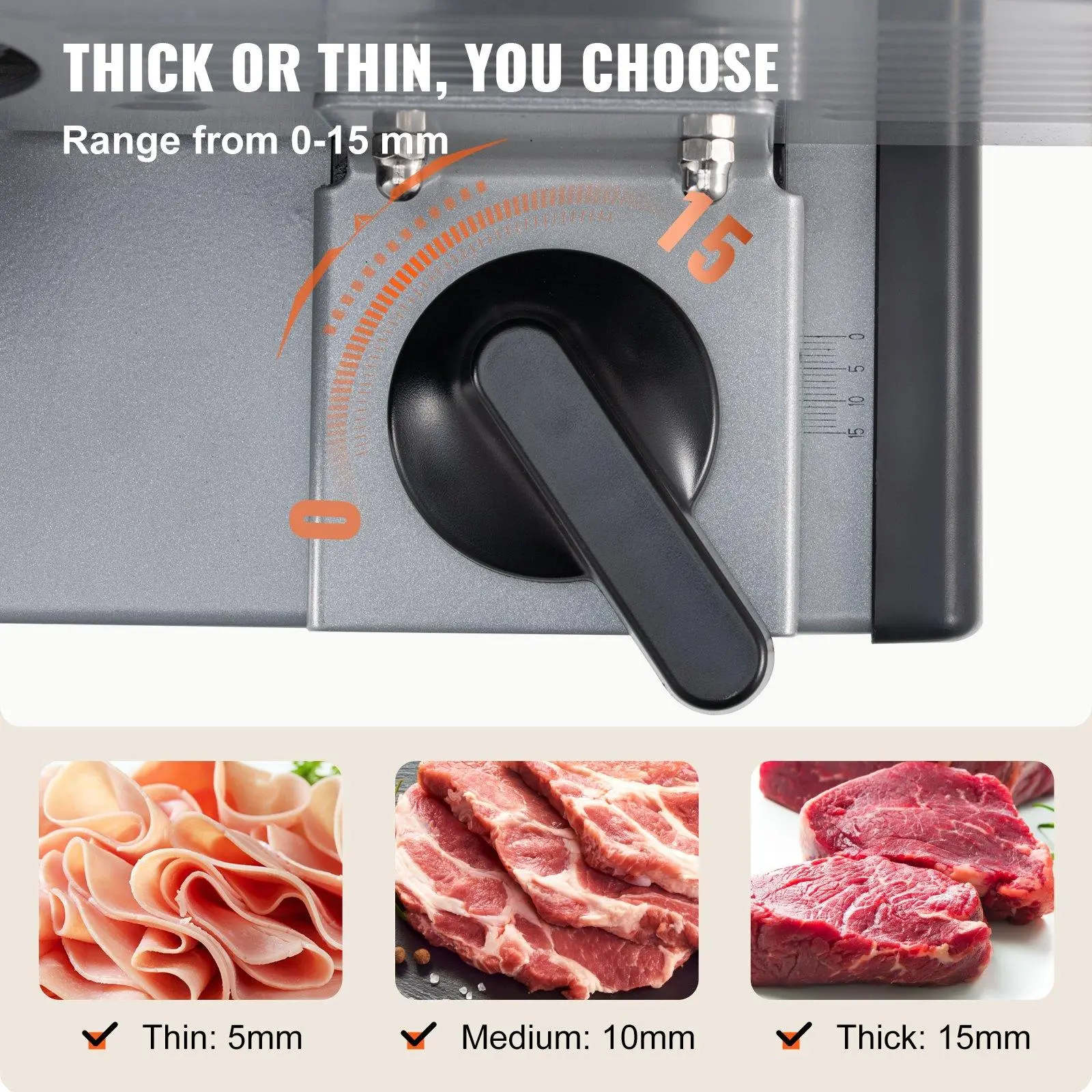 ·Precise Adjustable Thickness: Our meat slicer is equipped with a thickness-adjustable knob, making it effortless for you to easily adjust the slice thickness from 0mm to 15mm (0-0.6 inch) precisely. It is suitable for frozen meat, deli, cheese, roast beef, bread, vegetables, fruits, etc. According to your needs, cut ingredients of different thicknesses. Let's cut together!