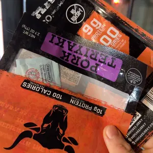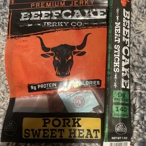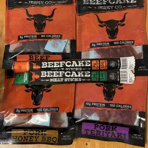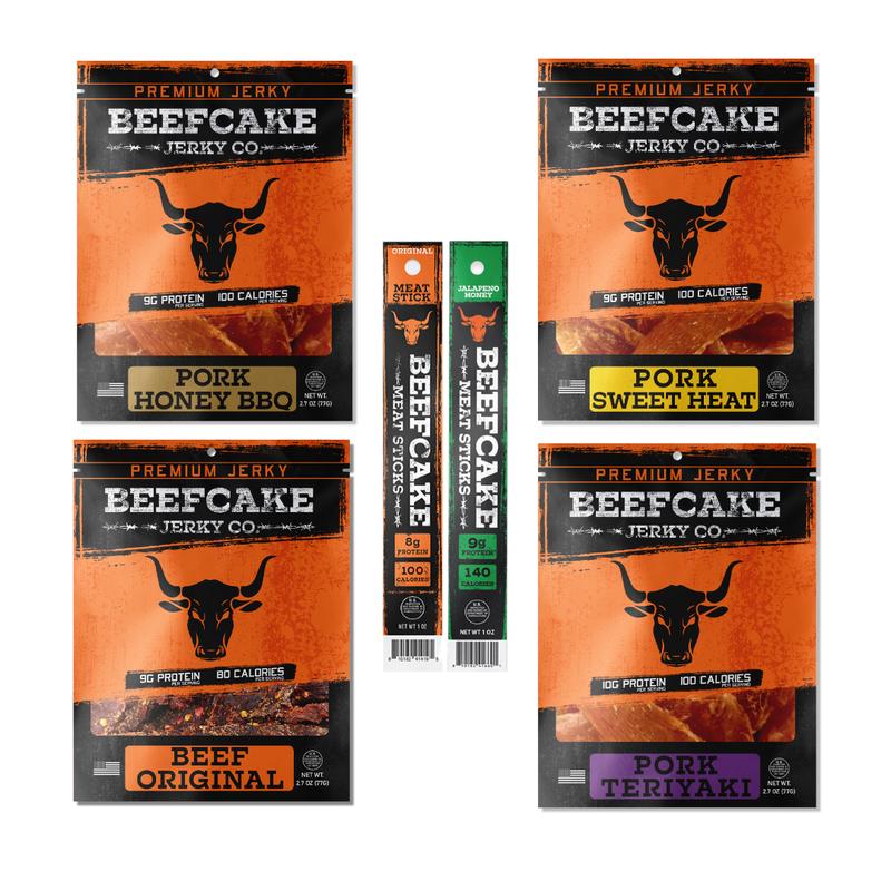 Great sample pack. It came with 4 bags of jerky and 2 sticks. Great value. I instantly finished a bag & my husband another. The only thing that threw me off is that it's called beefcake yet most of it was pork.