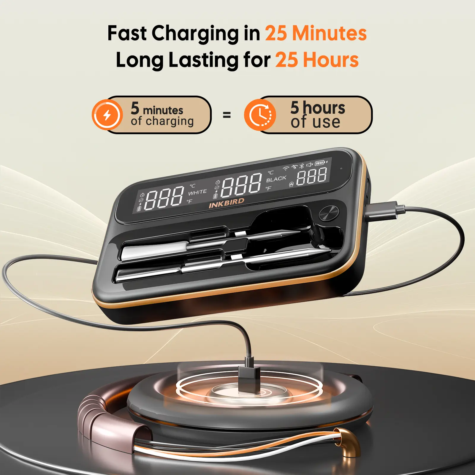 Fpr overnight cooking: built-in 2500 mah lithium battery in base for charging the probes; both probes can be fully charged in just 25 minutes and last for 25 hours, making them ideal for long-term temperature monitoring tasks such as sous-vide cooking and ham smoking.