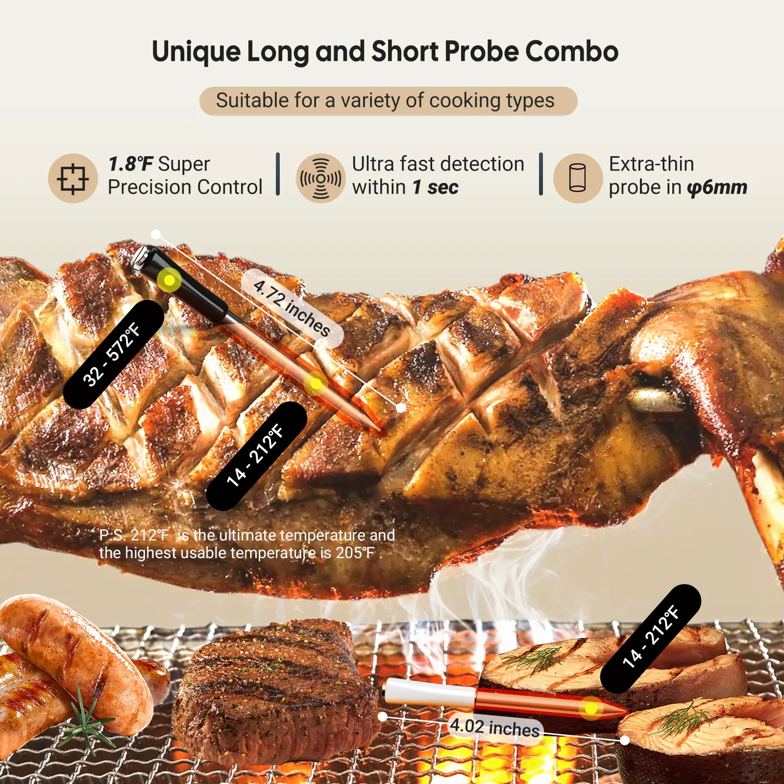 Long and short probes: 12 cm / 4.72 inches long probe for thick steaks and 10.2 cm / 4.02 inches short probe for delicate fish, offering perfect adaptation. long probe simultaneously measures food and oven temperatures and the short one measures food temperature only.