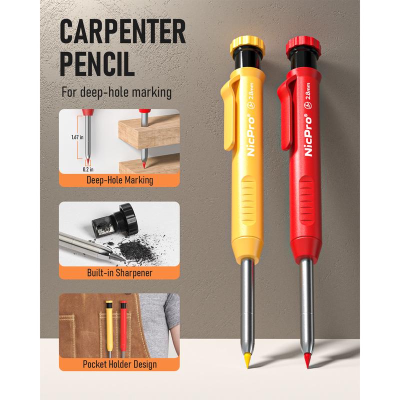 Upgrade your woodworking with the Nicpro 5 Pack Mechanical Carpenter Pencil Set. This set includes 5 pencils, 76 refills (black, red, yellow), and a carbide scribe tool. Perfect for architects and construction professionals, these pencils are heavy-duty and ideal for deep hole markers. Comes with a case for easy storage. 📏