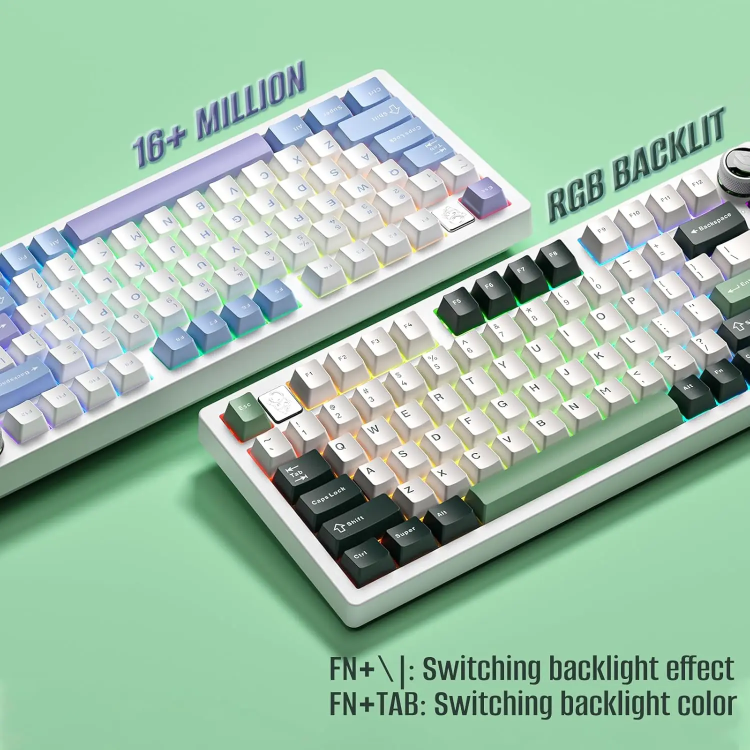 ·RGB Rainbow Backlit Keyboard: This light up keyboard features 16.8 million RGB light color, with 16 pre-set lighting effects to add a great atmosphere to the game. Lighting brightness and speed can be adjusted by the knob or the FN+key combination. With Macro soft, you can create unique lighting setup to make your rgb keyboard more interesting and create a personalized work or gaming environment