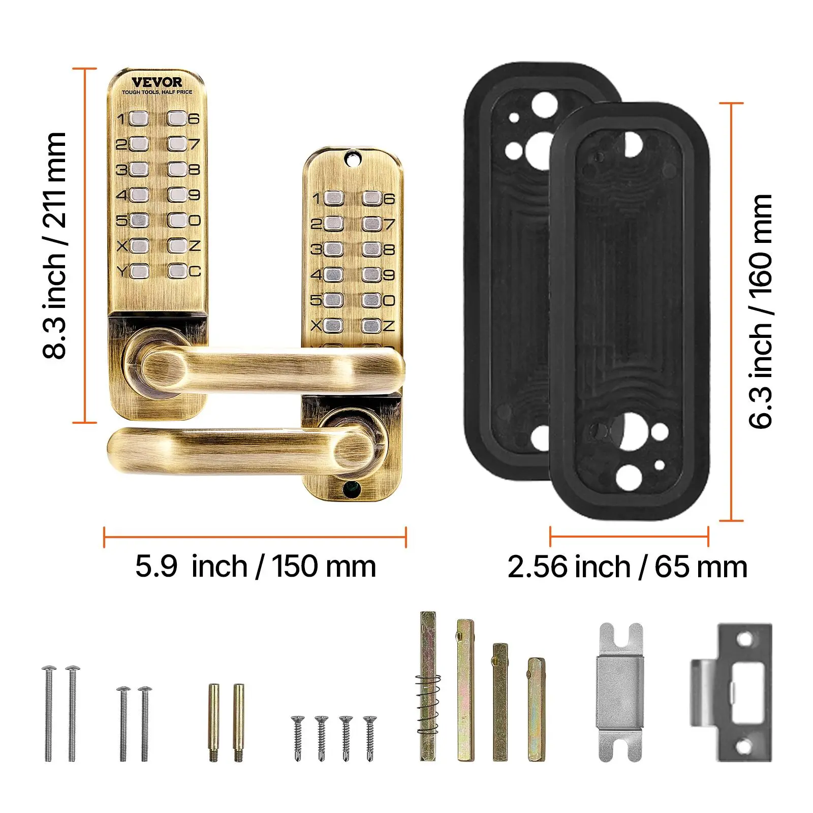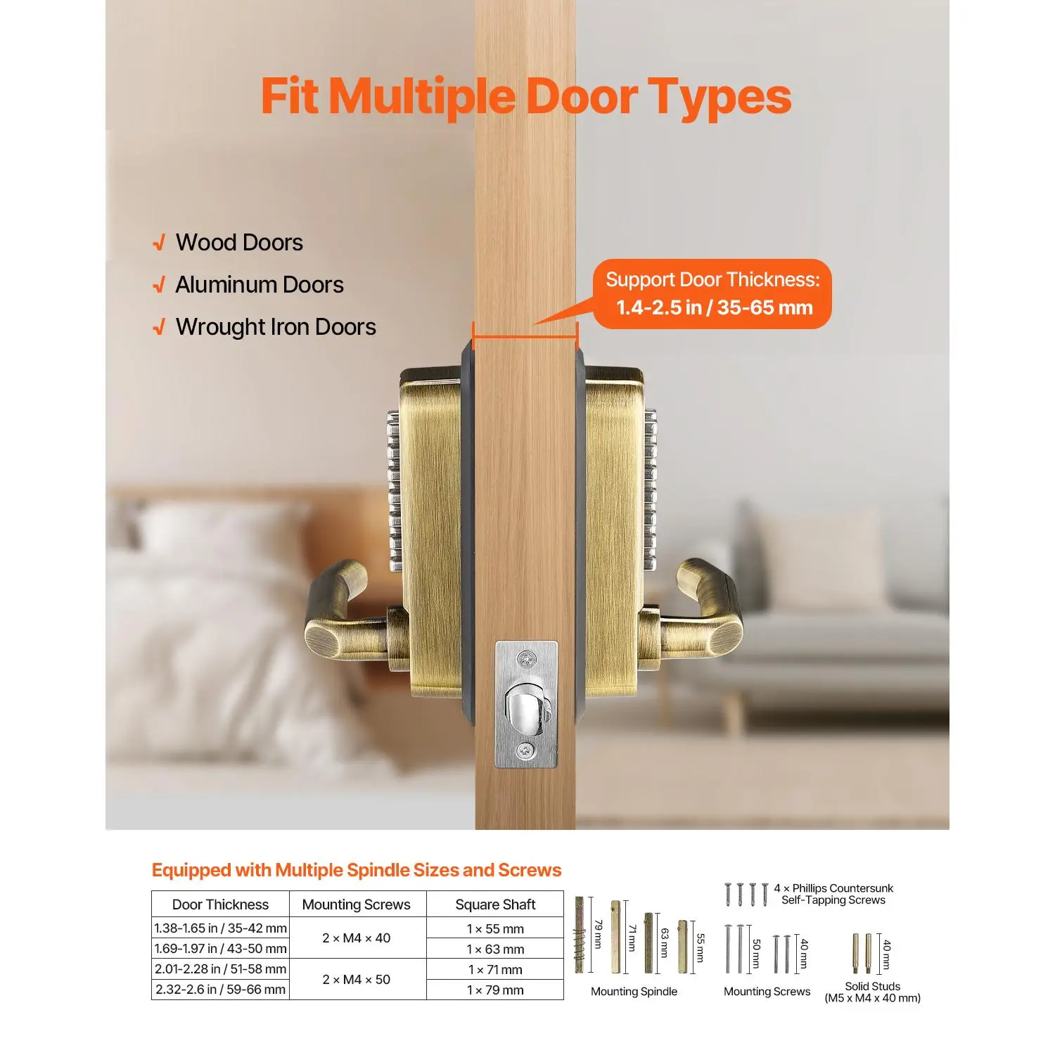 • Universal Compatibility with Various Doors: This mechanical keyless door lock comes with multiple sets of screws and square shafts, making it compatible with doors ranging from 1.4 to 2.5 in (35-65 mm) in thickness. It fits a wide range of door types including gates, garden doors, garages, storage rooms, wrought iron, aluminum, and fence doors