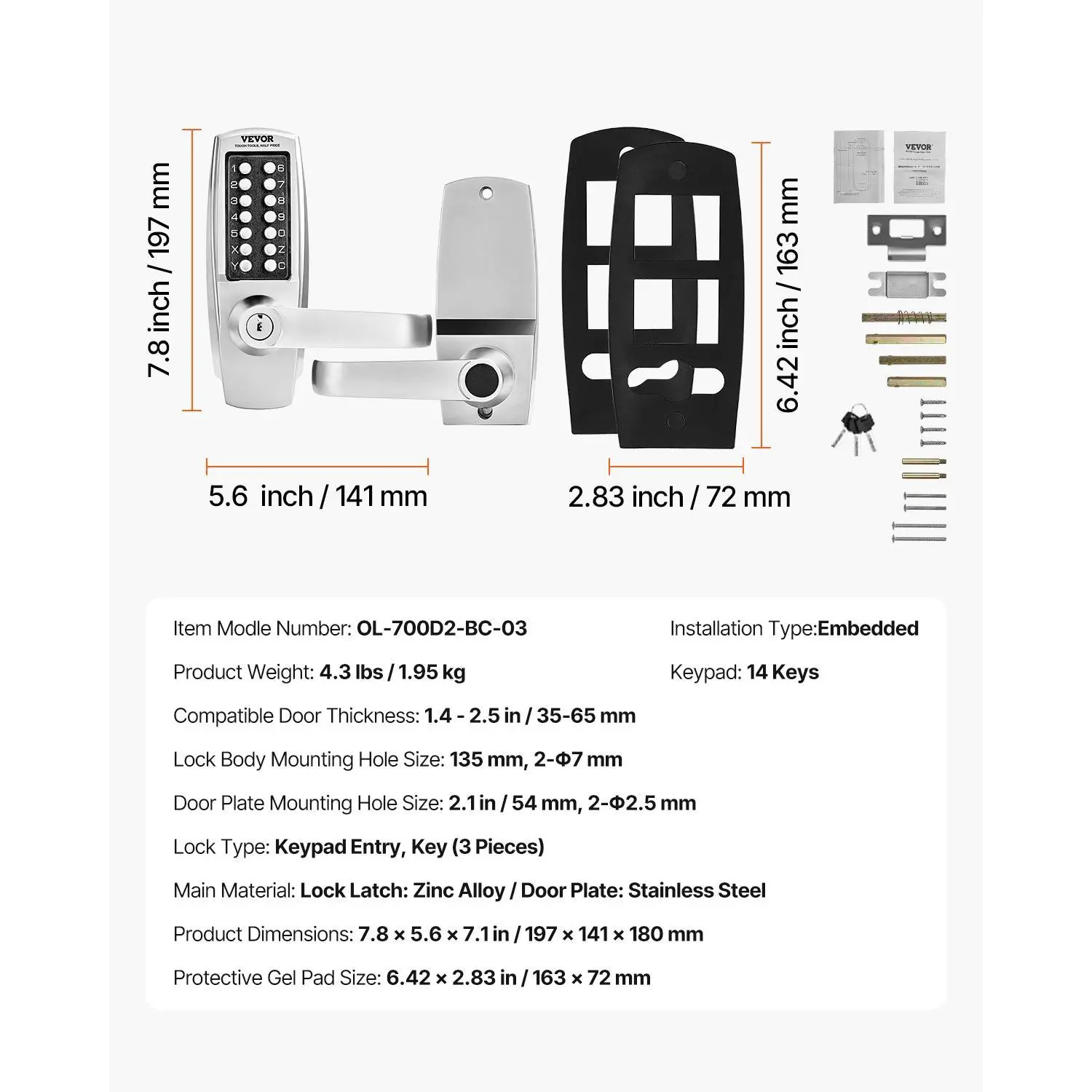 • Universal Compatibility for Various Doors: This mechanical keyless door lock comes with a variety of screws and square shafts, allowing it to fit doors from 1.4 to 2.5 in (35-65 mm) thick. It's compatible with a wide range of doors, including gates, garden doors, garages, storage rooms, wrought iron, aluminum, and fence doors