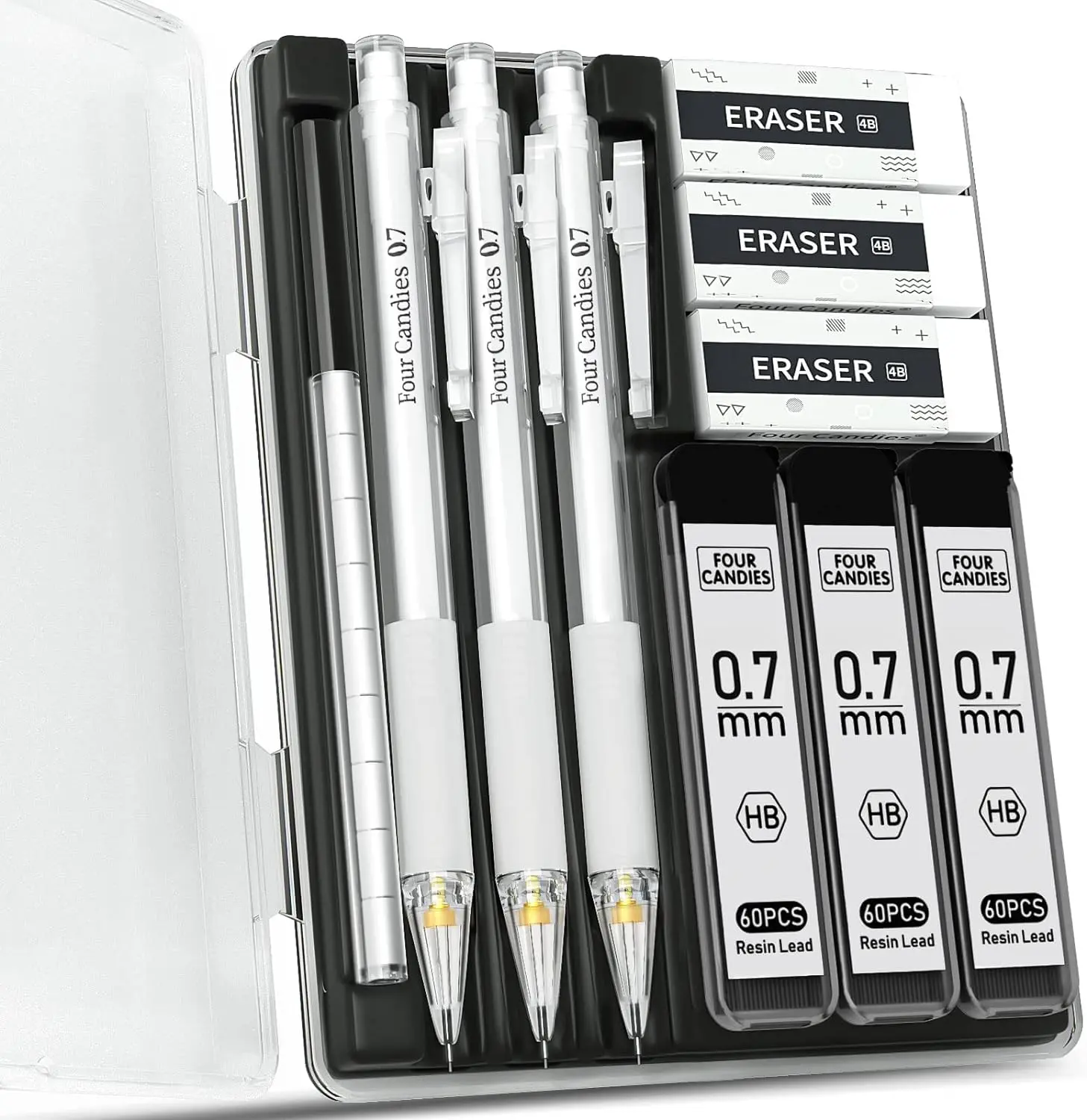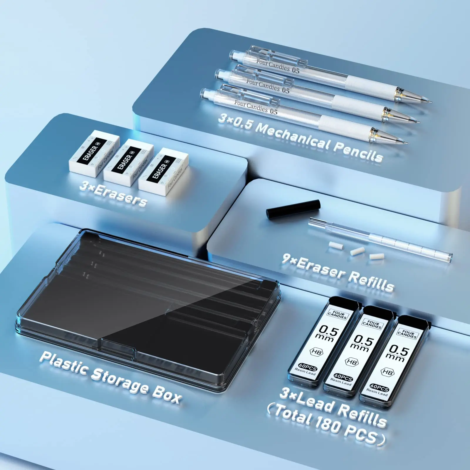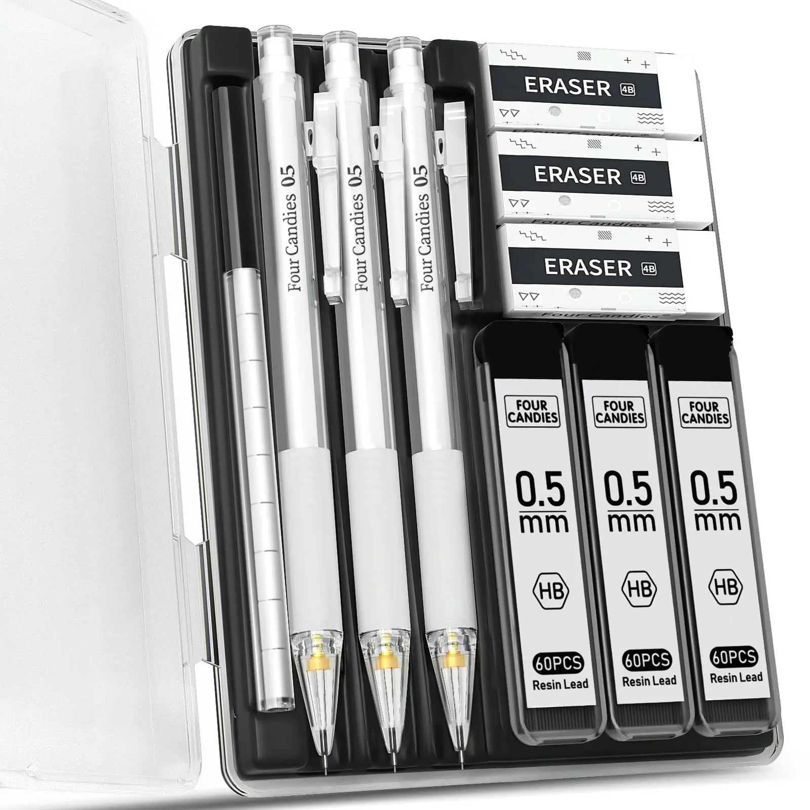 ✨ Includes: 3 clear 0.5mm pencils, 3 HB lead refills (180pcs), 3 erasers, 9 eraser refills, and a plastic storage case. Perfect for students, drawing, and writing.