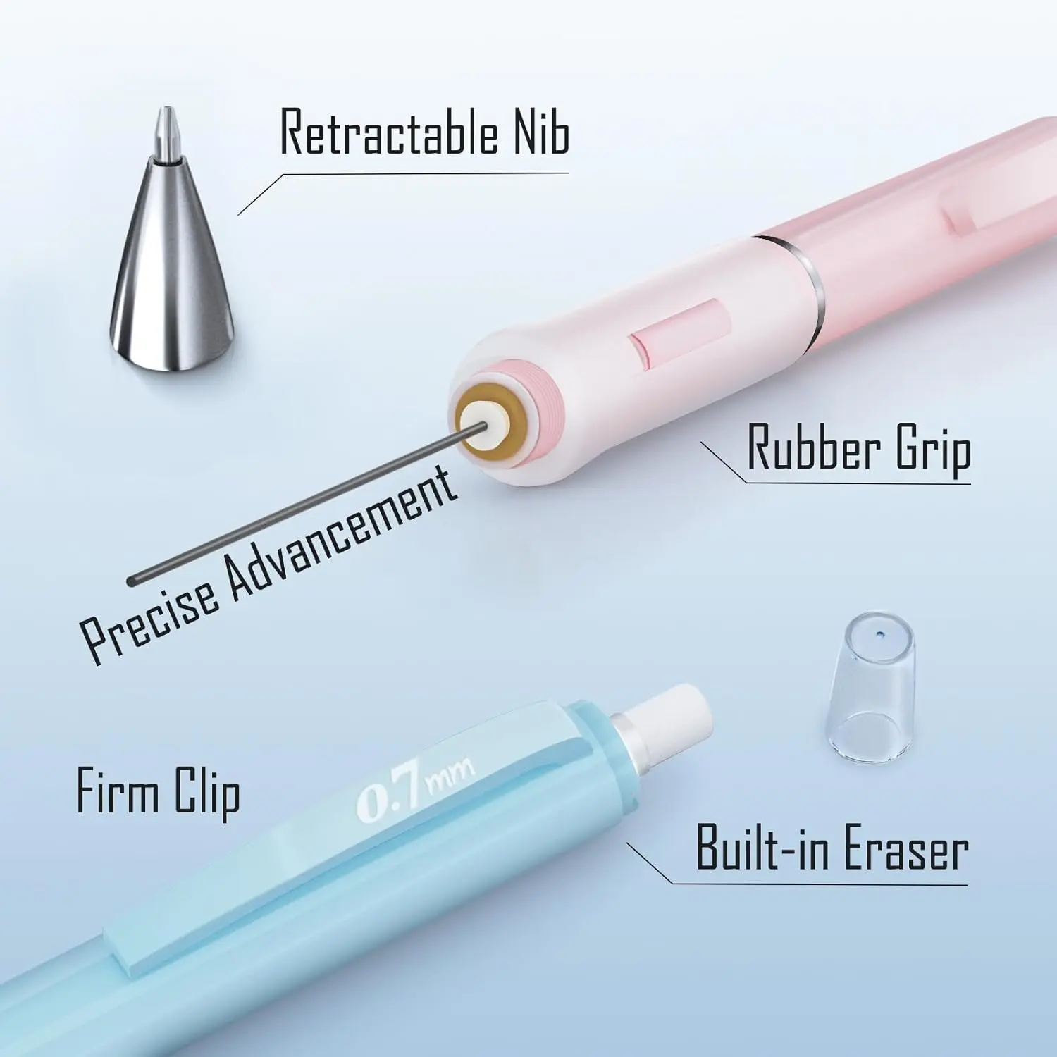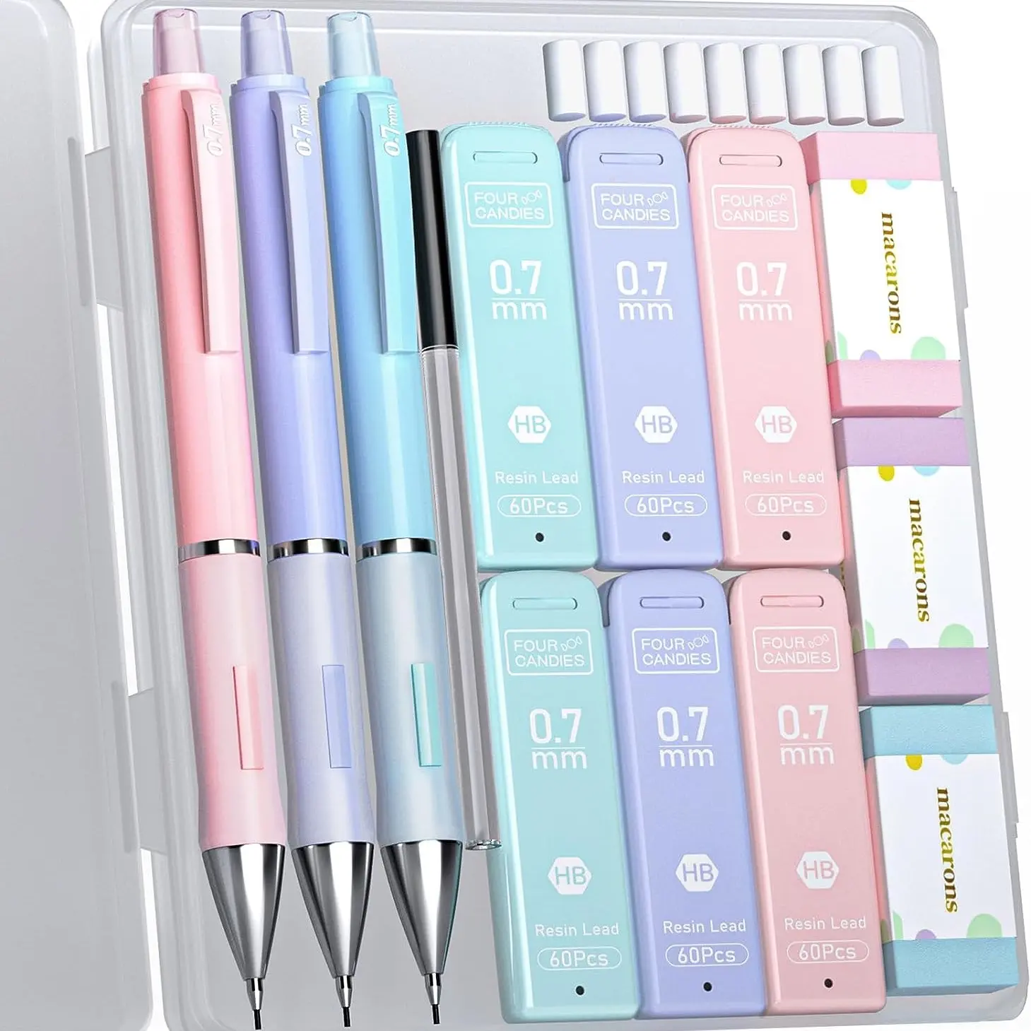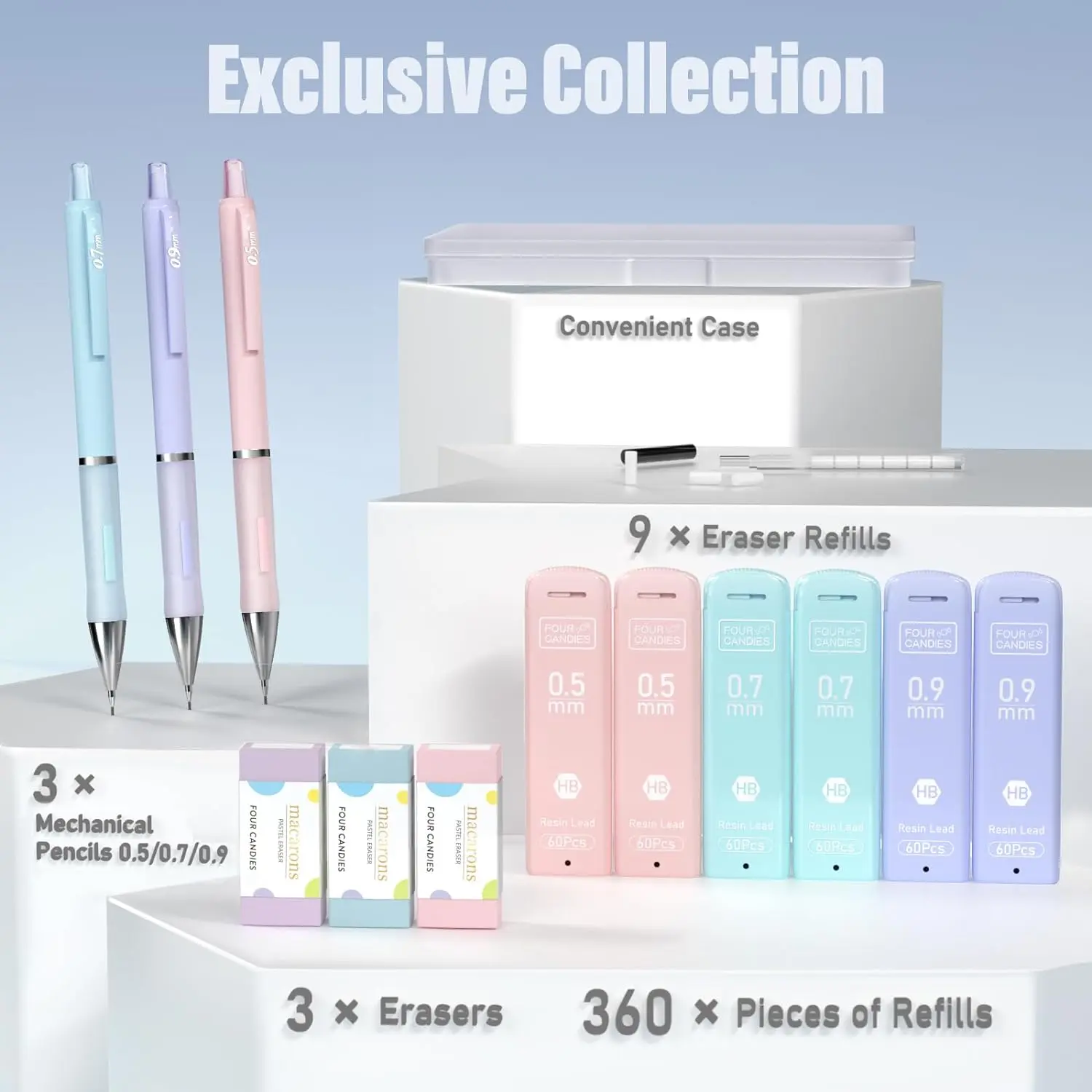 ·📏 Contains 3 pastel mechanical pencils (0.5mm, 0.7mm, 0.9mm).