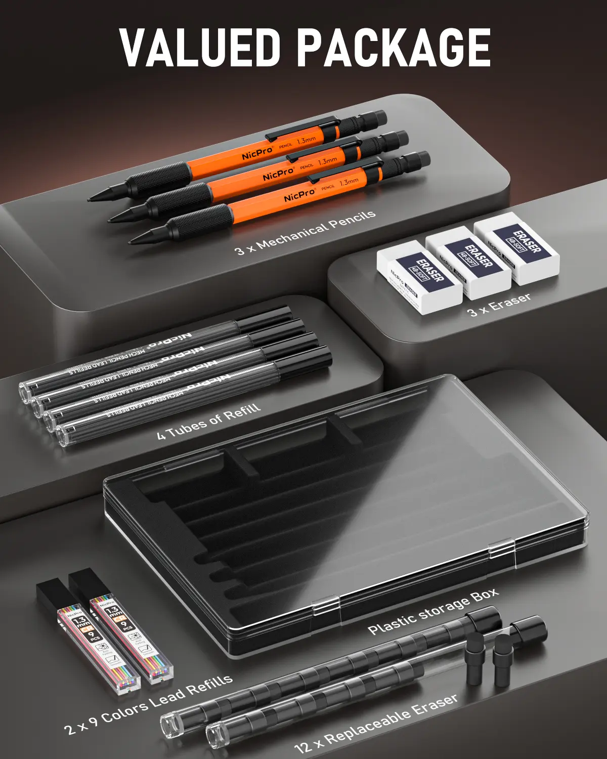 ·Includes 3 Pack 1.3mm orange mechanical pencils, 3 Pack 4B erasers, 12 Pack eraser refills, 4 tubes of lead refills (12 Pack/tube, 120mm length), and 2 tubes x 9 color lead refills.