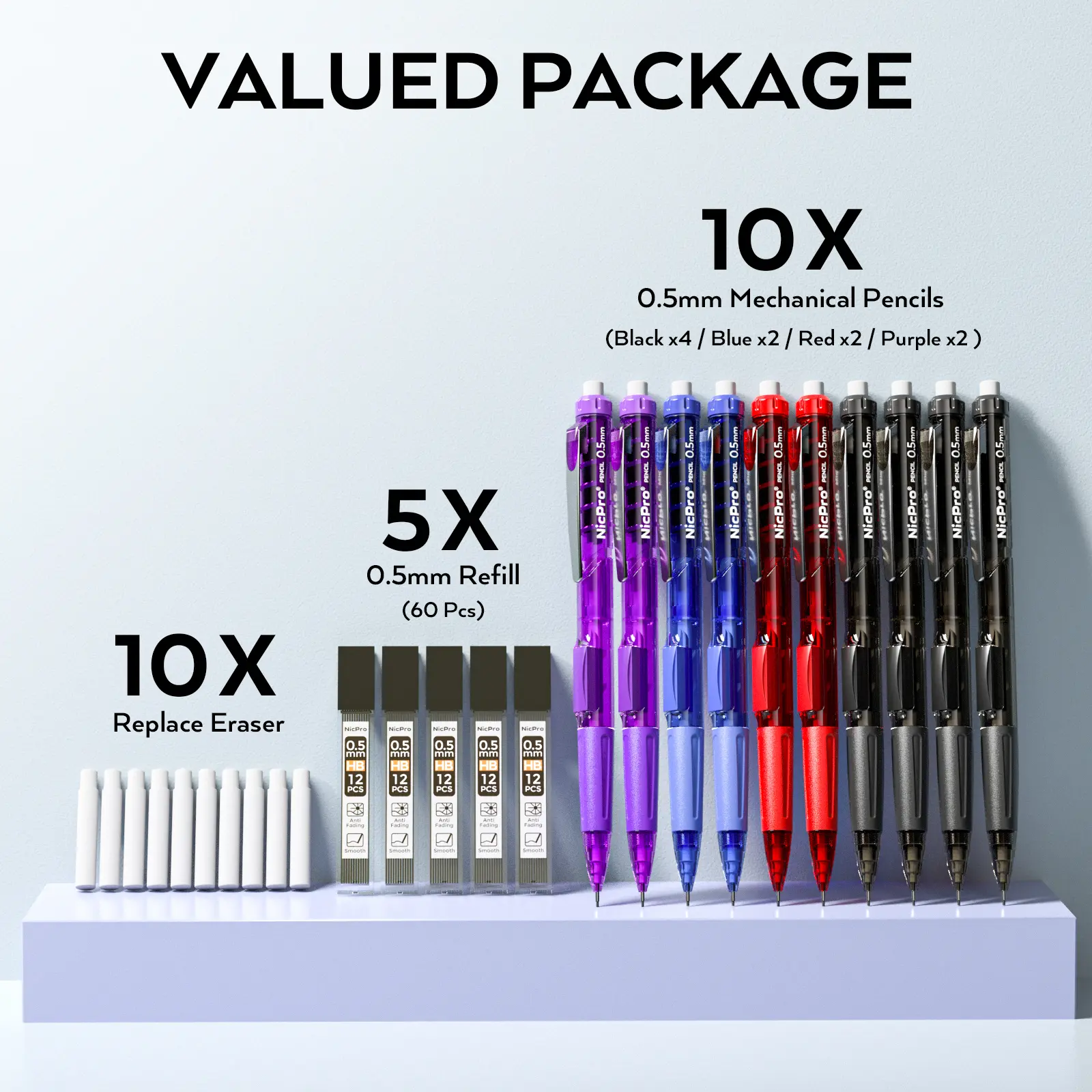 - Includes 10 black, blue, red, and purple 0.5mm mechanical pencils.