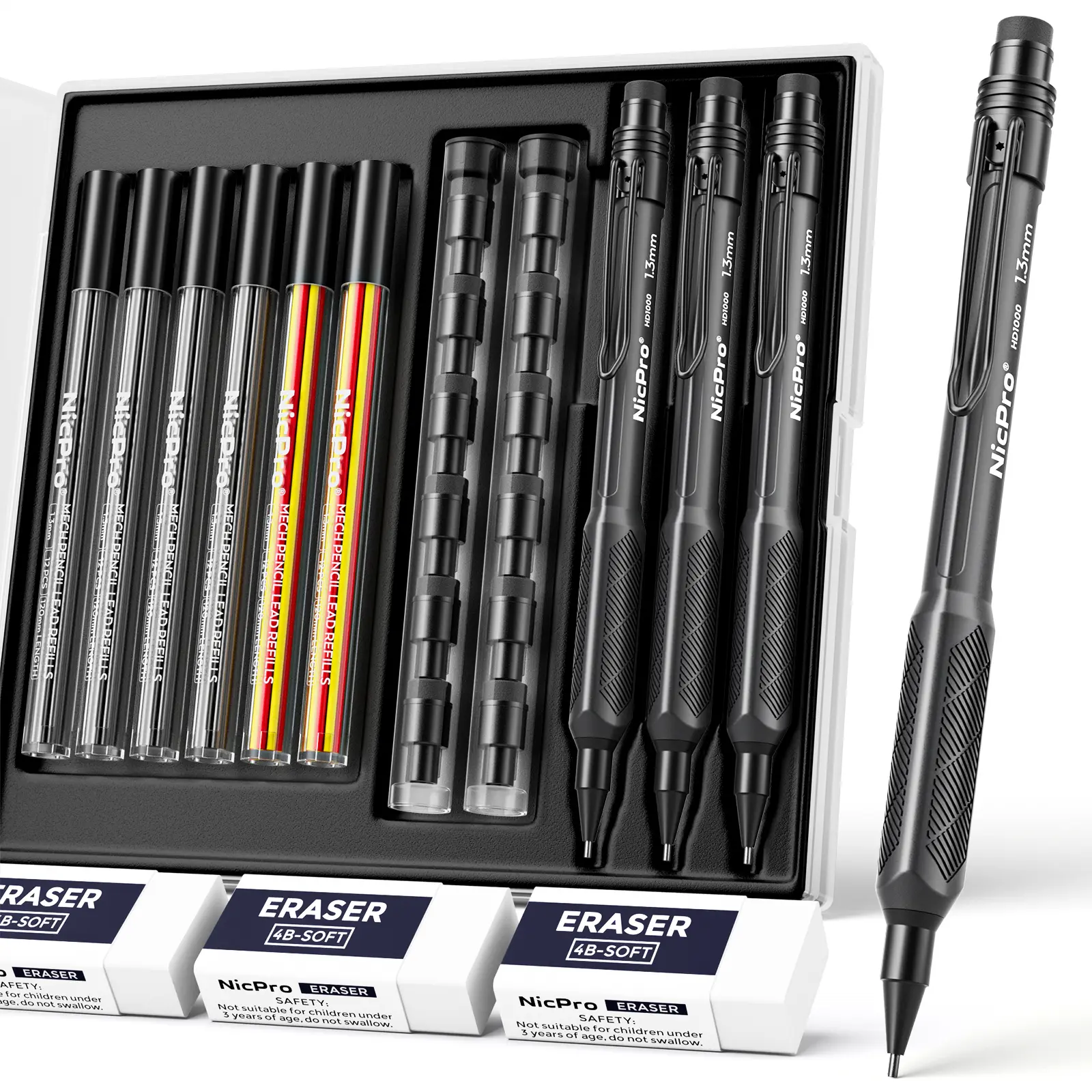 Nicpro 3 Pack 1.3 mm Mechanical Pencil Set with 72 Pack Lead Refill, 3 Erasers-HD1000 Carpenter Pencils, Weatherproof Metal Heavy Duty Construction Pencil for Outdoor Marking Drafting Drawing Woodworking