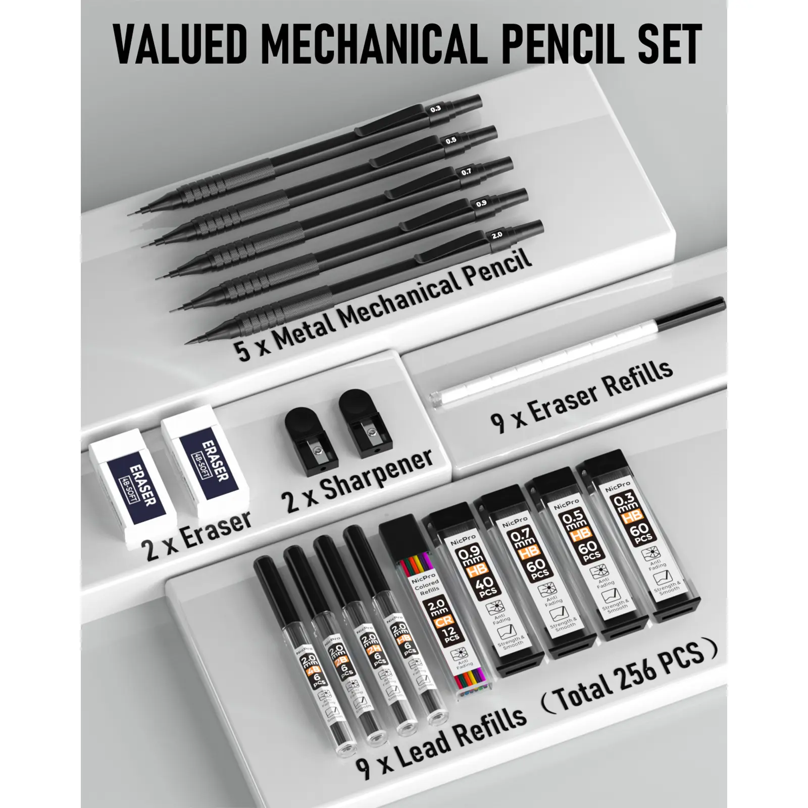 Β·γValue Mechanical Pencils Setγ: The drafting pencil set come with 5 Pack metal mechanical pencils in 5 sizes: 0.3, 0.5, 0.7, 0.9 and 2.0mm, 4 tubes HB lead refill (60 Pack/tube), 5 tubes 2.0mm refills (4B, 2H, HB, 2B, Colors), 2 Pack erasers, 9 Pack eraser refills, 2 Pack lead sharpener, a plastic pencil case.
