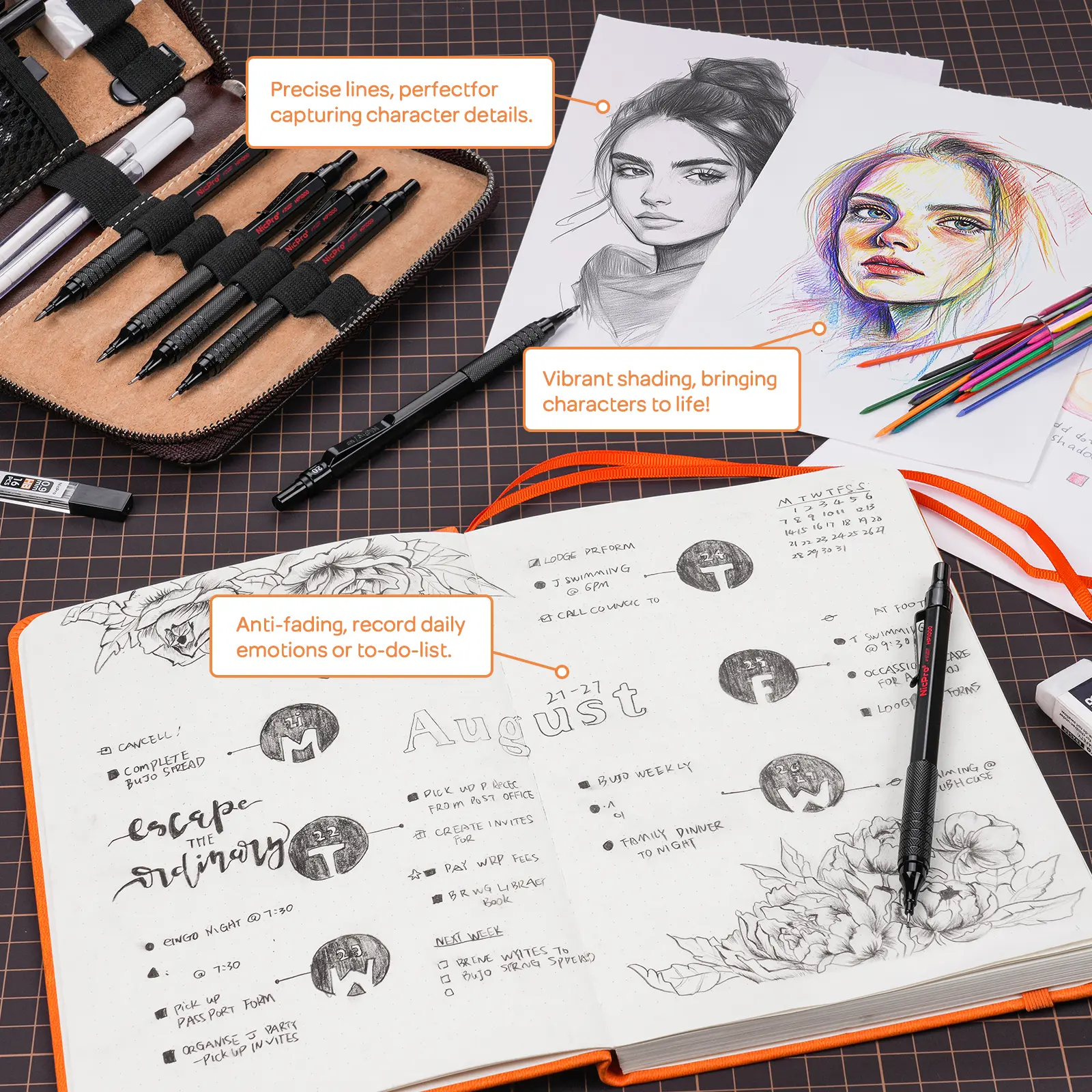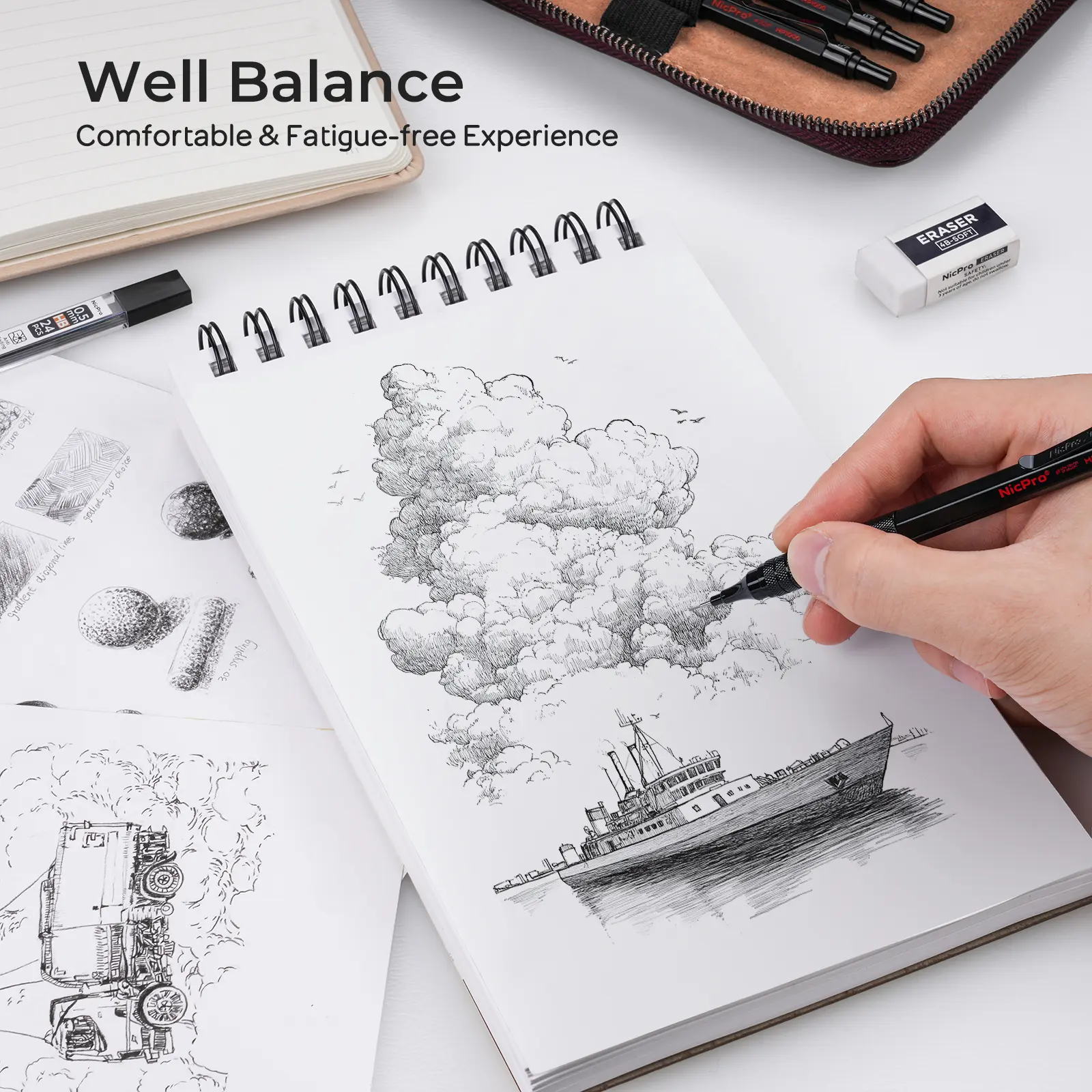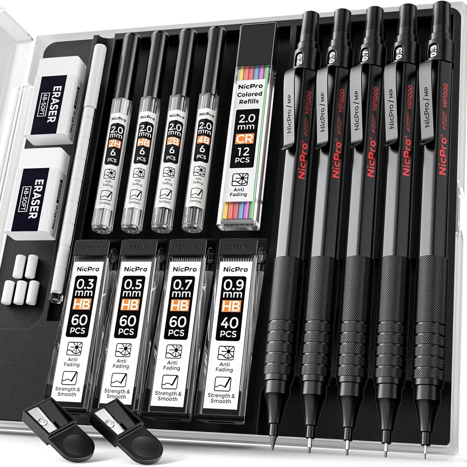 This Nicpro set includes five black art mechanical pencils: 0.3, 0.5, 0.7, 0.9, and 2mm. Each pencil comes with graphite lead holders and 4B, 2B, HB, and 2H colored leads. The set also features 9 lead refills and an eraser case. Ideal for drafting, these pencils offer strength and smooth writing.