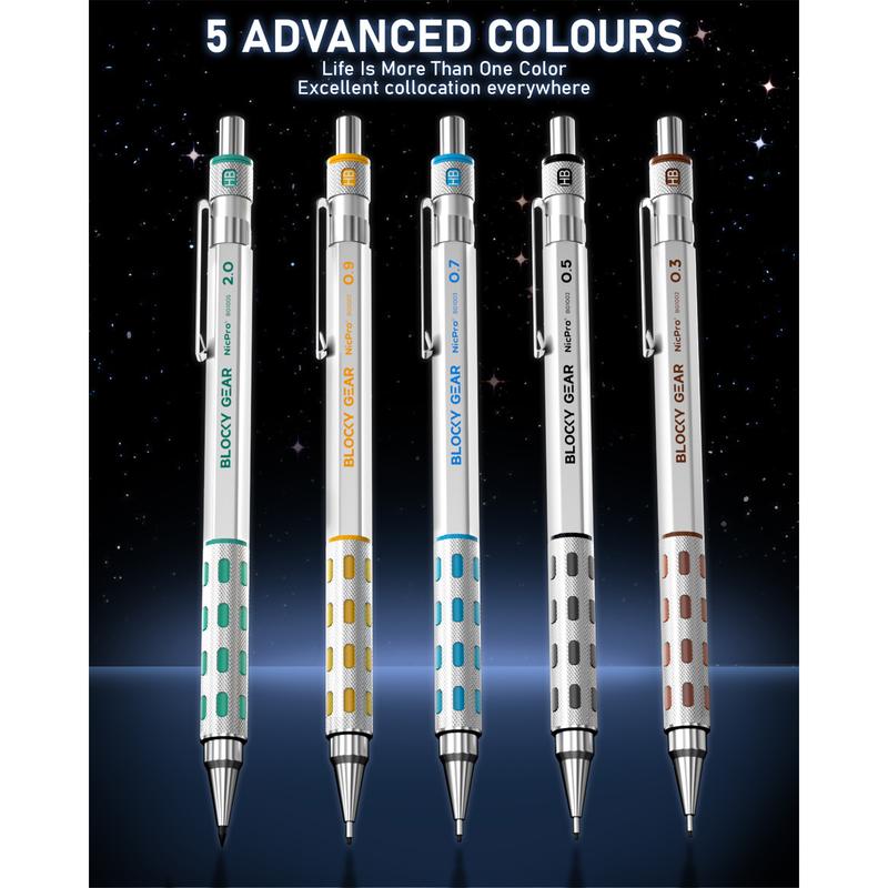 5. Nicpro Blocky Gear Metal Mechanical Pencil Set in Leather Case, 29PACK Art Drafting Pencils 0.3, 0.5, 0.7, 0.9&2mm Lead Pencil with 330Pack Lead (HB 2H 4H 2B 4B 6B Color) For Writing Sketching Drawing
