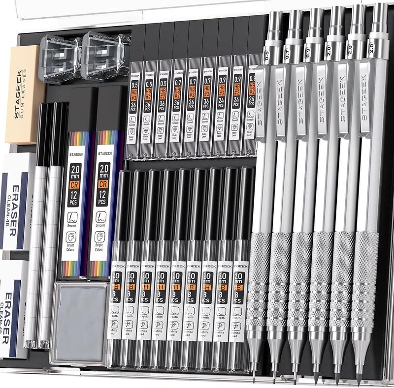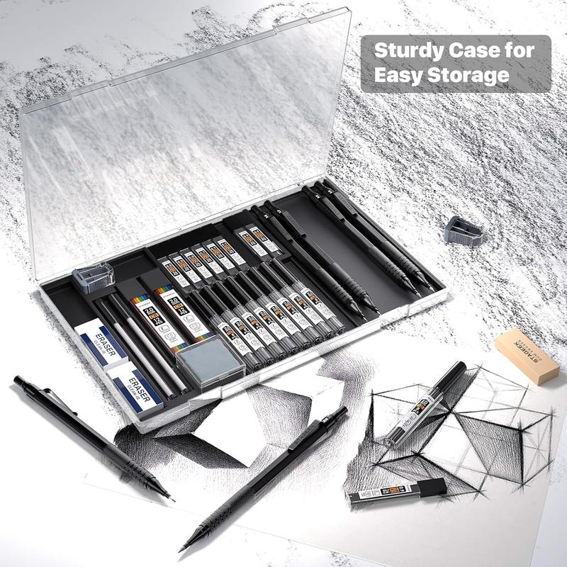 ·【Customized Mechanical Pencils Set】 Includes 6 x full body metal mechanical pencils; 4 models (0.5mm, 0.7mm, 0.9mm & 3pcs 2.0mm) and 9 x tubes of 0.5, 0.7, 0.9mm resin leads; 11 x tubes of 2.0mm graphite leads ; 2x lead sharpeners,;2x 4B-soft erasers, 1xgum eraser; 1x kneaded eraser; 2x tube eraser refills (9pcs / tube); 1x plastic case