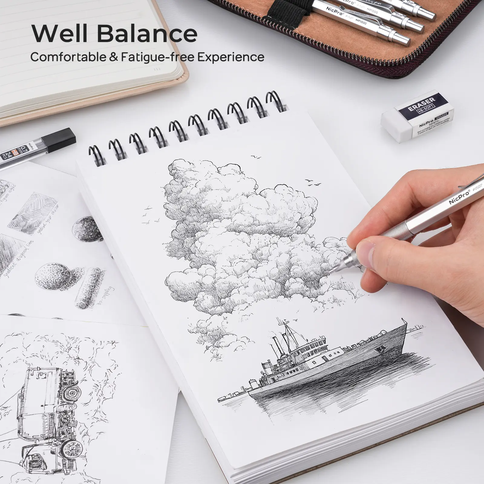 This Nicpro set includes 30 silver metal mechanical pencils in a leather case. Ideal for sketching and drawing, it features pencils in 0.5, 0.7, 0.9 mm, and 2mm leads. The set comes with 16 lead refills (6B, 4B, 2B, HB, 2H, 4H colors). Perfect for artists and drafters.