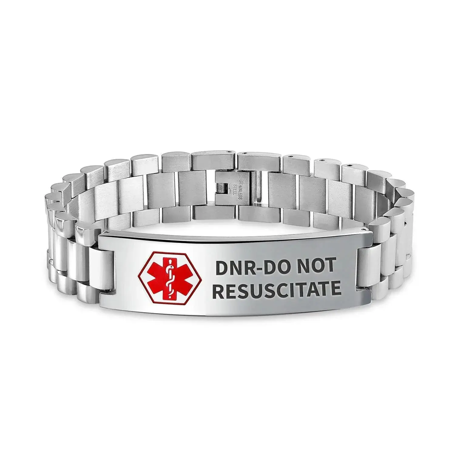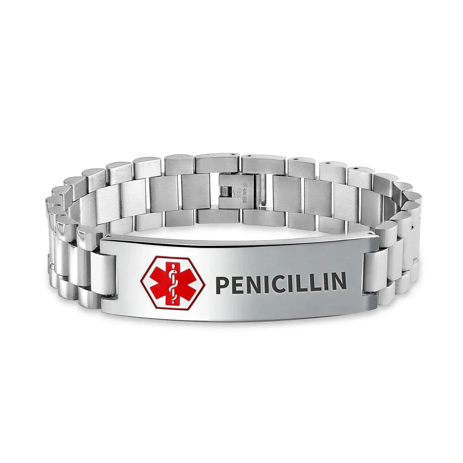 Personalized custom engraved medical bracelet for men, made of durable, hypoallergenic stainless steel. Chic, rugged look with polished links. Features internationally recognized medical caduceus symbol. Engrave vital medical information or severe allergies. Fits up to 8.5-inch wrist, ID bar measures 2x0.35 inches. Secure fold-over clasp for active lifestyles. Stylish and practical medical jewelry for men.