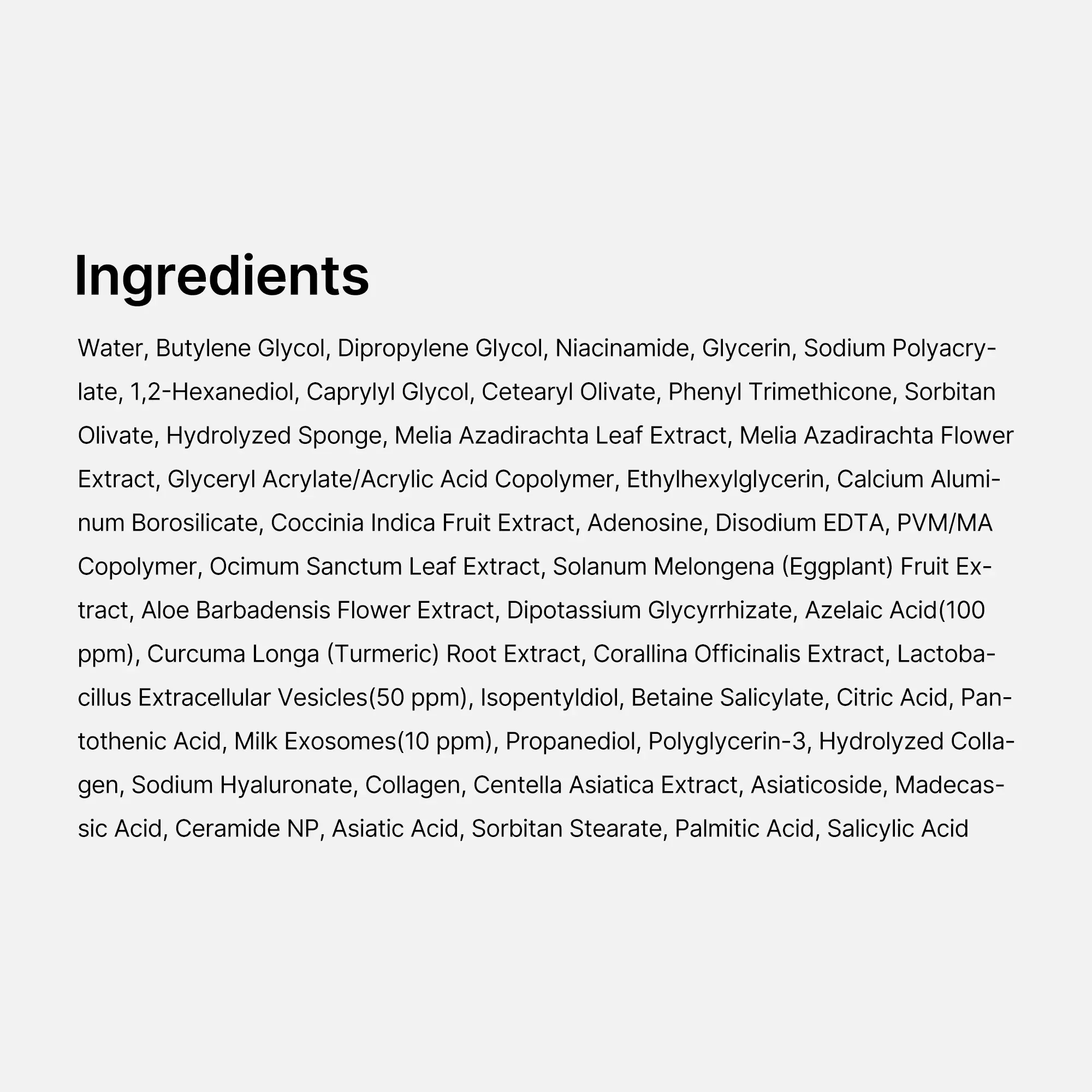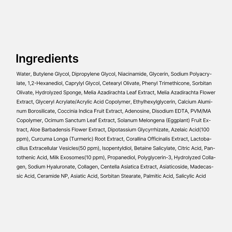 | Ingredients | Water,Butylene Glycol,Dipropylene Glycol,Niacinamide,Glycerin,Sodium Polyacrylate,1,2-Hexanediol,Caprylyl Glycol,Cetearyl Olivate,Phenyl Trimethicone,Sorbitan Olivate,Hydrolyzed Sponge,Melia Azadirachta Leaf Extract,Melia Azadirachta Flower Extract,Glyceryl Acrylate/Acrylic Acid Copolymer,Ethylhexylglycerin,Calcium Aluminum Borosilicate,Coccinia Indica Fruit Extract,Adenosine,Disodium EDTA,PVM/MA Copolymer,Ocimum Sanctum Leaf Extract,Solanum Melongena (Eggplant) Fruit Extract,Aloe Barbadensis Flower Extract,Dipotassium Glycyrrhizate,Azelaic Acid(100 ppm),Curcuma Longa (Turmeric) Root Extract,Corallina Officinalis Extract,Lactobacillus Extracellular Vesicles(50 ppm),Isopentyldiol,Betaine Salicylate,Citric Acid,Pantothenic Acid,Milk Exosomes(10 ppm),Propanediol,Polyglycerin-3,Hydrolyzed Collagen,Sodium Hyaluronate,Collagen,Centella Asiatica Extract,Asiaticoside,Madecassic Acid,Ceramide NP,Asiatic Acid,Sorbitan Stearate,Palmitic Acid,Salicylic Acid |