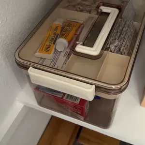 Perfect size for regular bottles of meds. Love the clear container so I can see what Iām looking for without digging through the box. Too storage area is perfect for loose items like bandaids, alcohol wipes and extra cough drops!