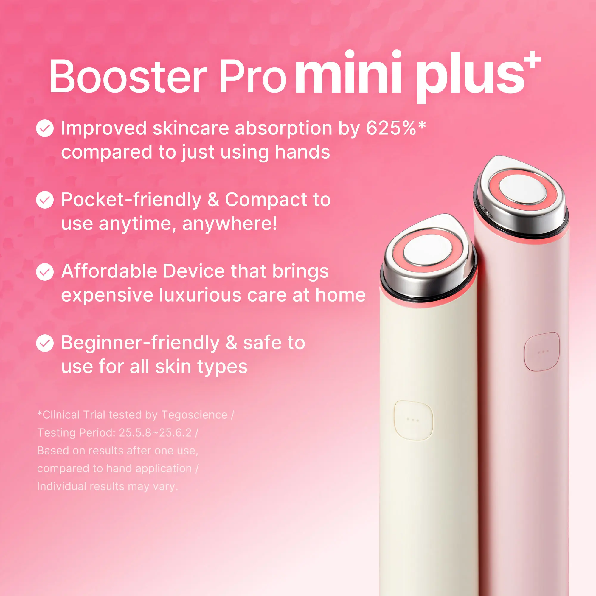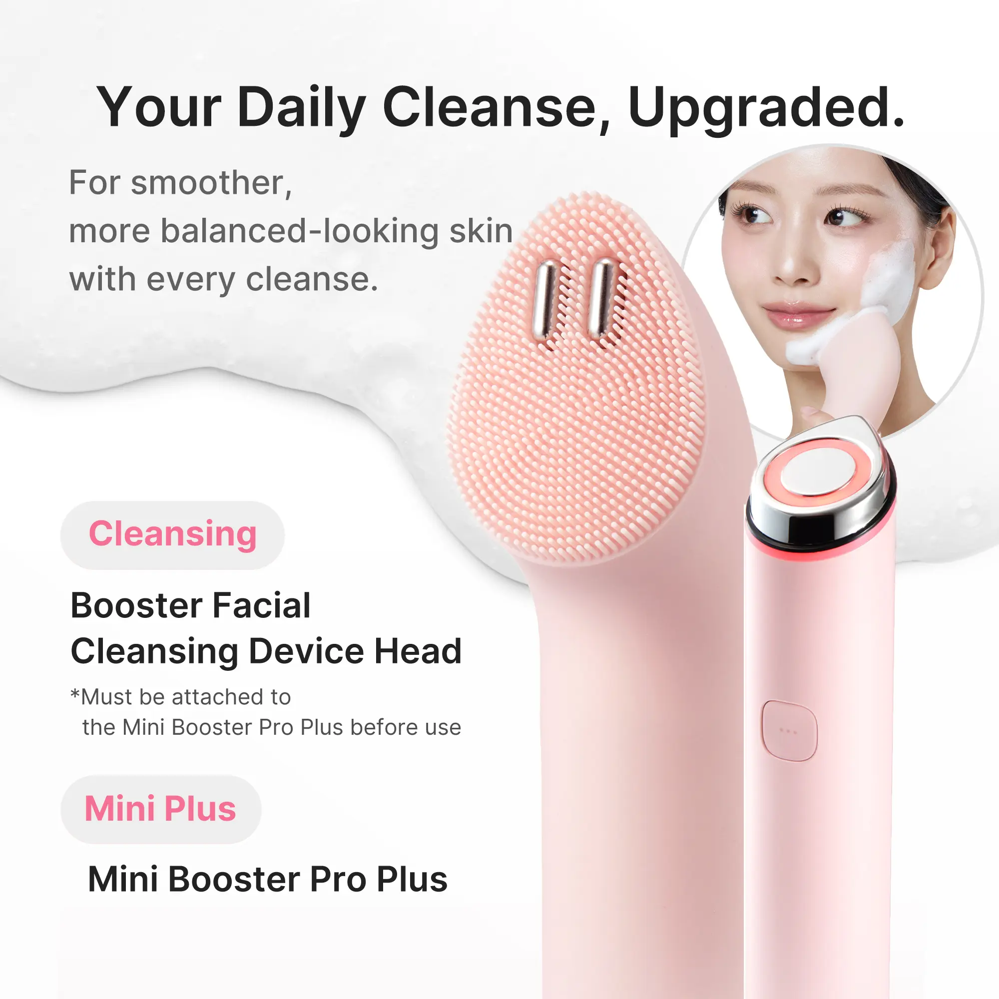 The Booster Pro Mini Plus is an upgraded model featuring a smart connector that supports interchangeable heads (Cleansing Head and V-Roller Head). It also offers enhanced skin permeability support to help improve skincare absorption.