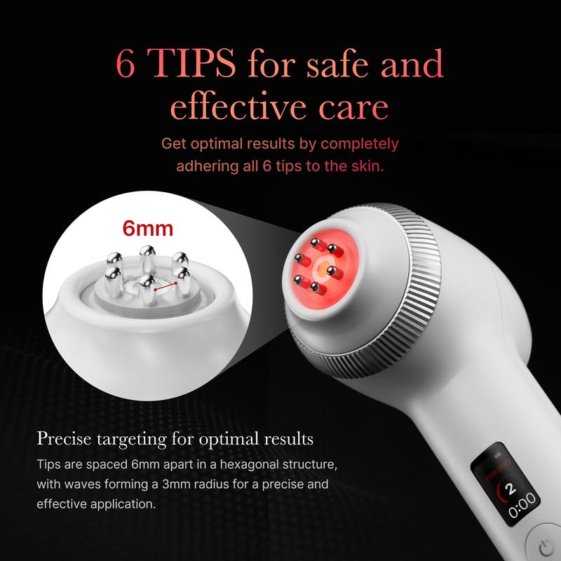 Get optimal results by completely adhering all 6 tips to the skin. Tips are spaced 6mm apart in a hexagonal structure, with waves forming a 3mm radius for a precise and effective application.