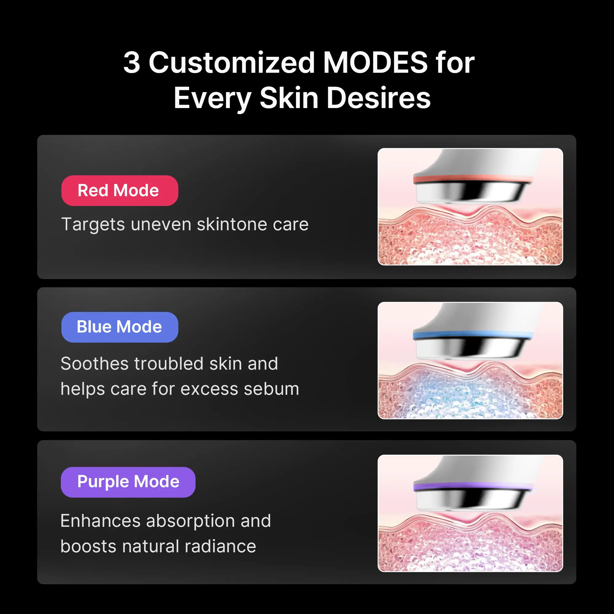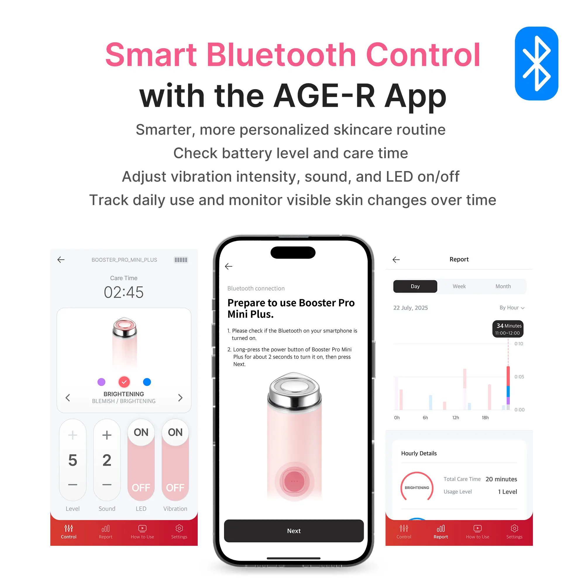 The Booster Pro Mini Plus is an upgraded model featuring a smart connector that supports interchangeable heads (Cleansing Head and V-Roller Head). It also offers enhanced skin permeability support to help improve skincare absorption.