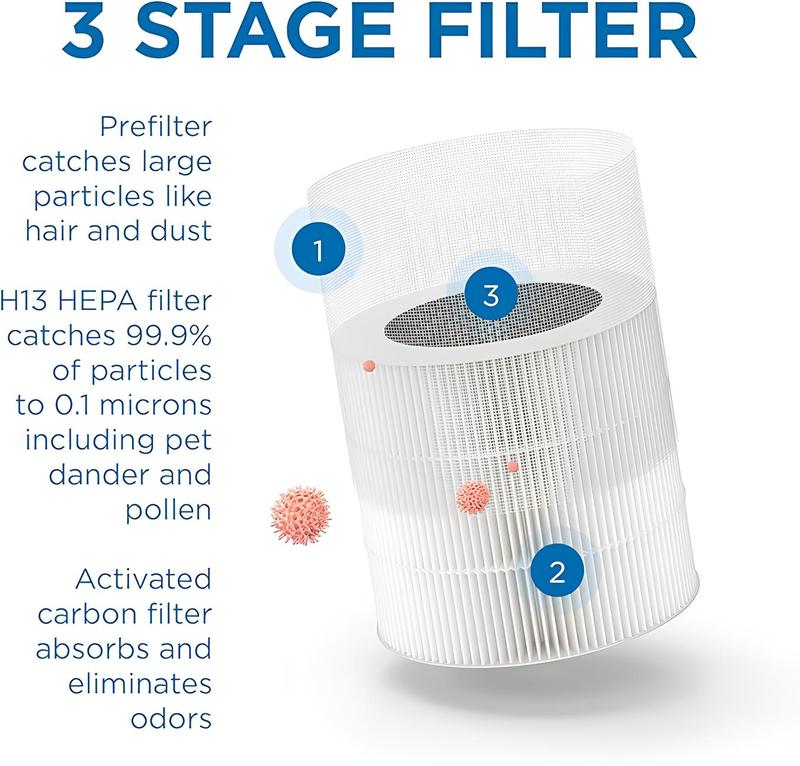 ·3-Stage System: Pre-filter, advanced filtration, and odor-reducing layer.