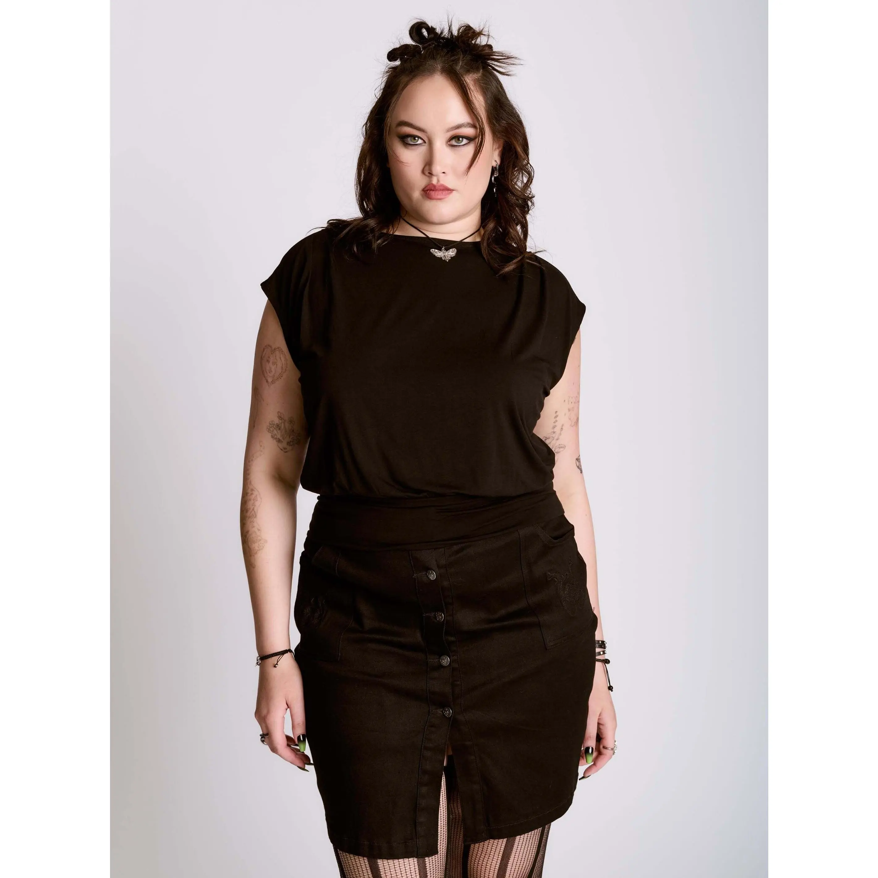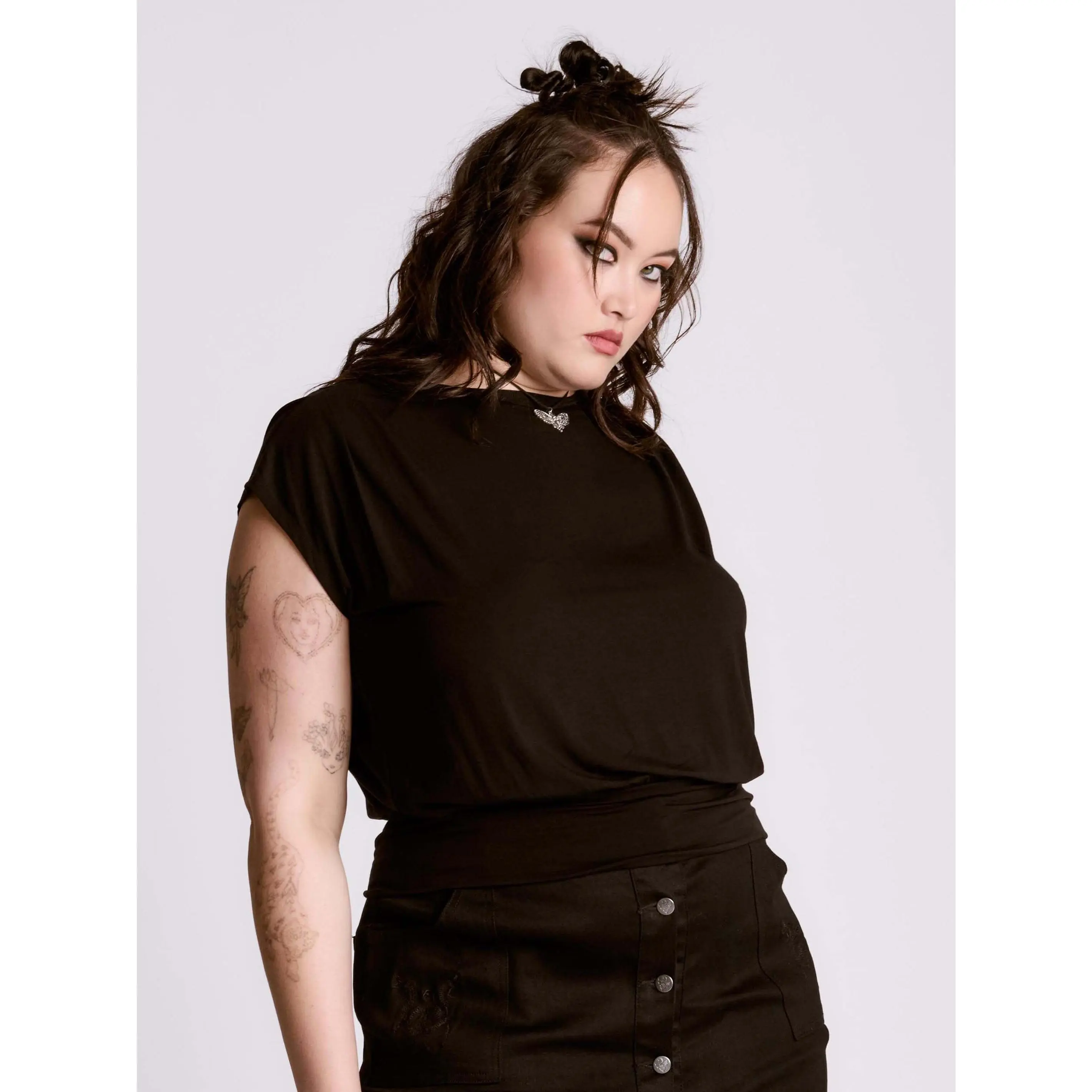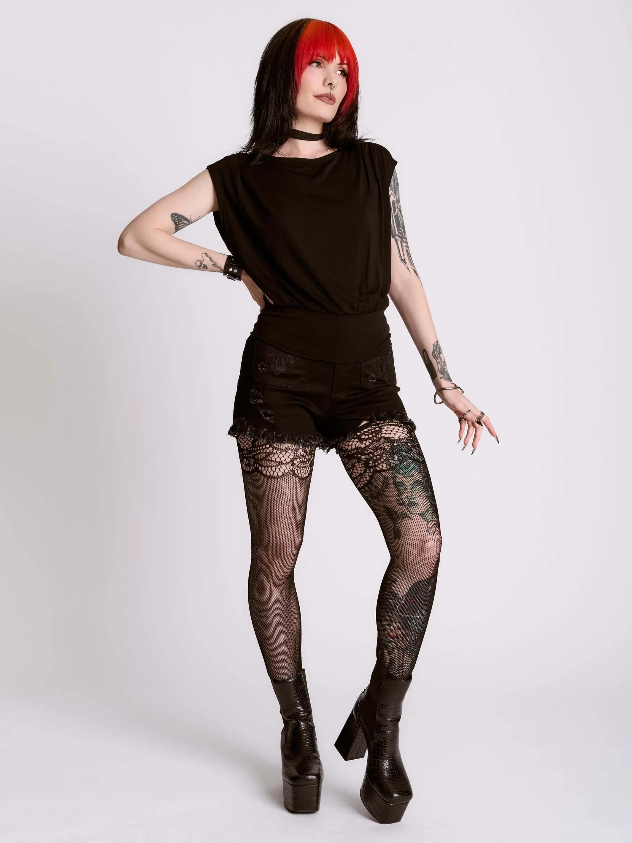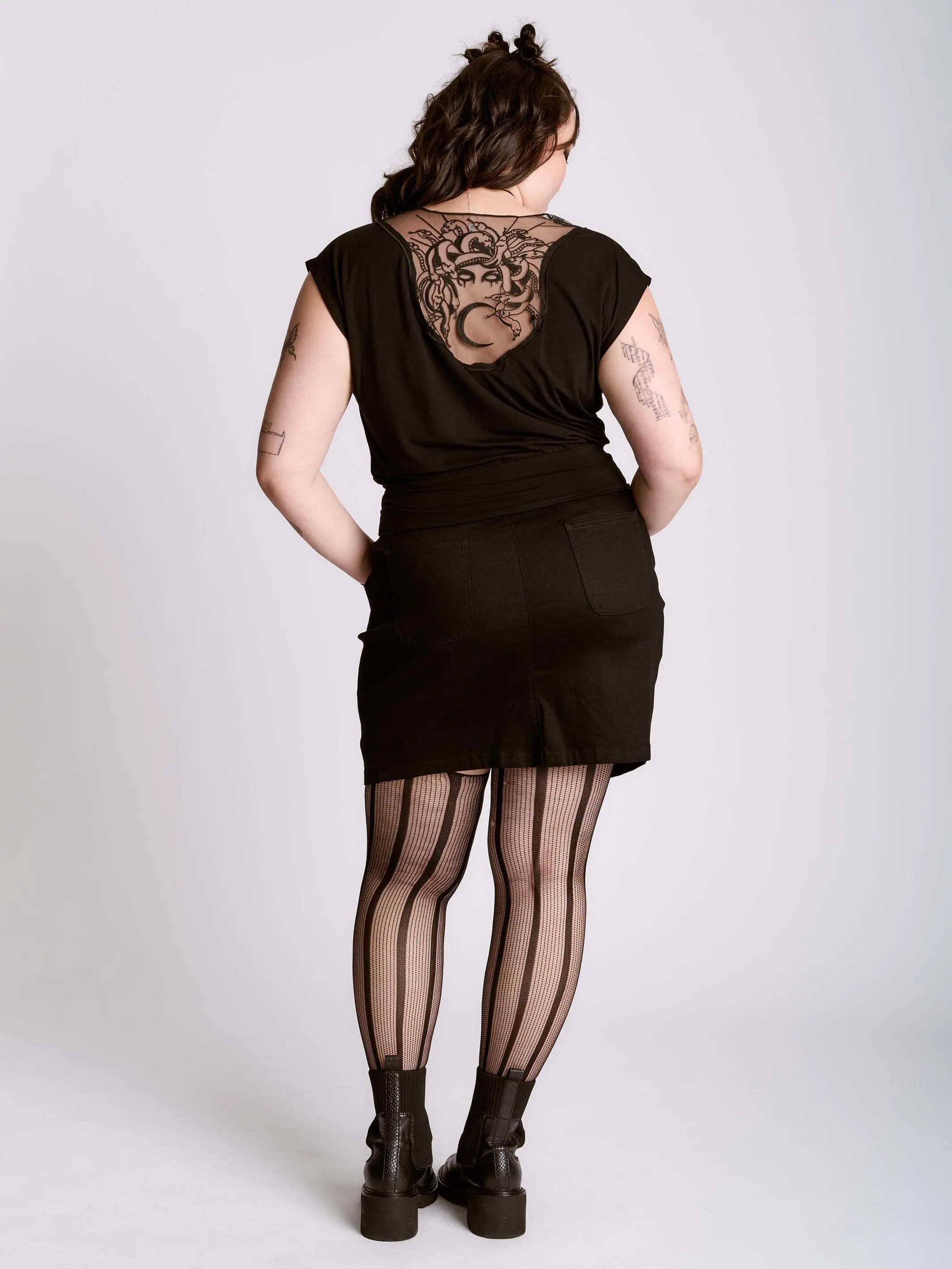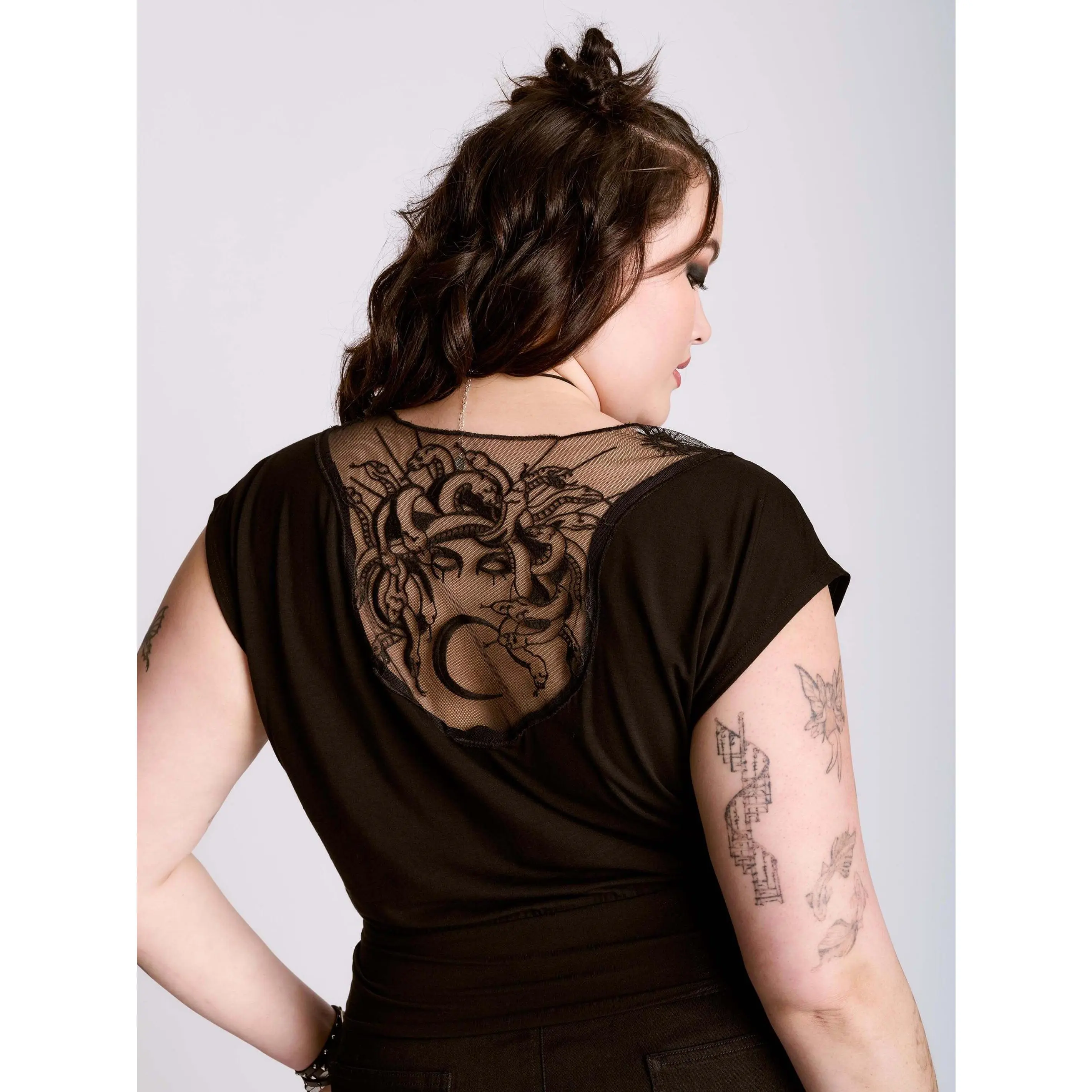 Draped rayon spandex knit jersey,  with cinched waistband creates the perfect silhouette.  Add in our embroidered mesh applique of Medusa on the back for a drop of decadence.