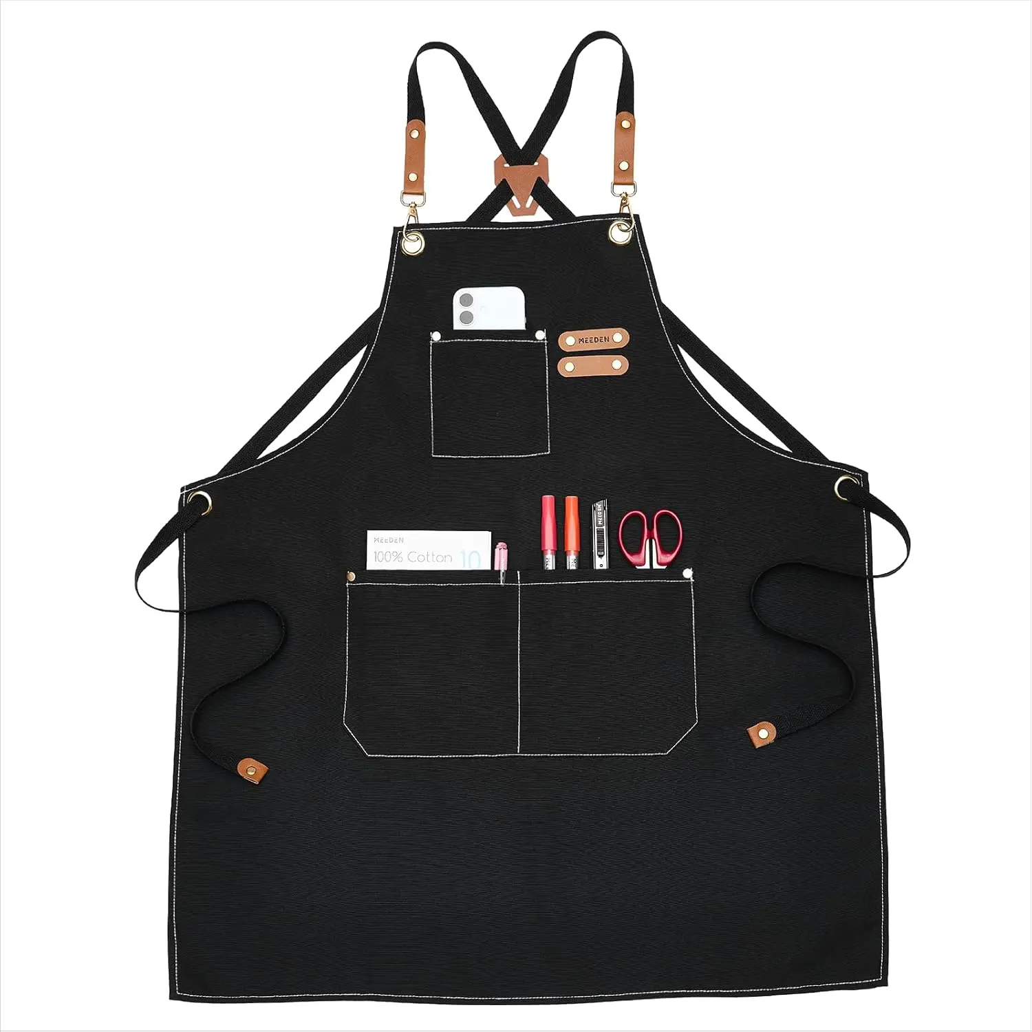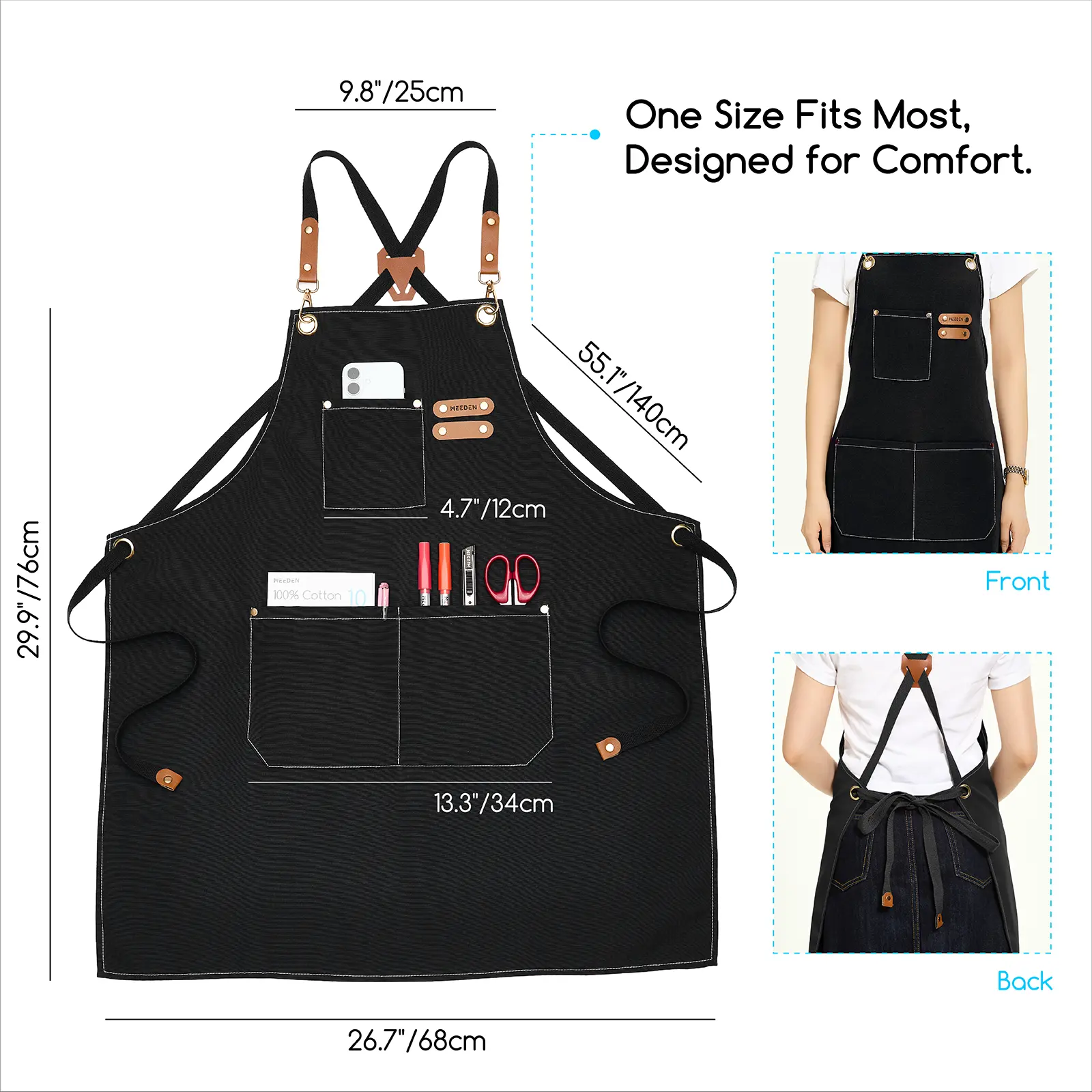 ·Adjustable & Removable Straps: The work apron is 29.5" long and 26.7" wide. The painter apron features a cross-back design with adjustable straps that fit most people perfectly: men, women, students, adults, painting hobbyists, and various sizes people. Brass metal buckles and synthetic leather secure the two removable straps for easy donning and doffing, and durability