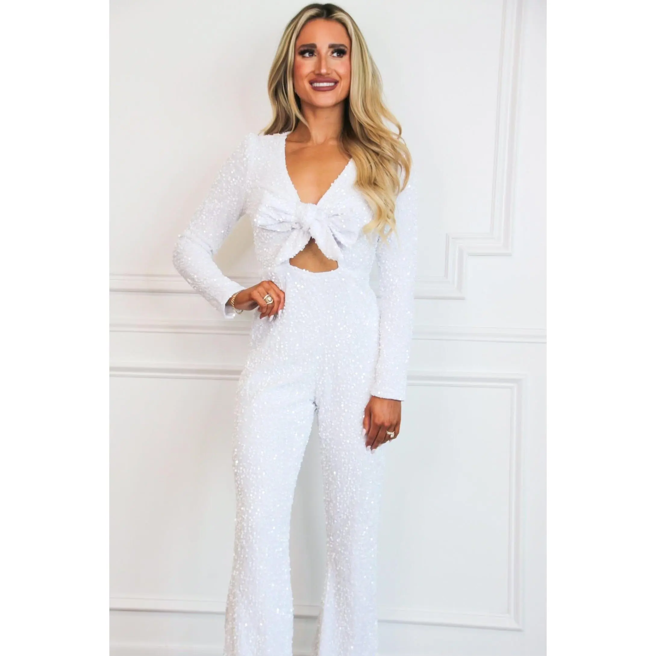 Shine bright in this winter white sequin jumpsuit with a statement bow and flattering fitted silhouette.@Bella and Bloom Boutique  #sequinjumpsuit #winterwhiteoutfit #holidayglam #eveningstyle #partyready