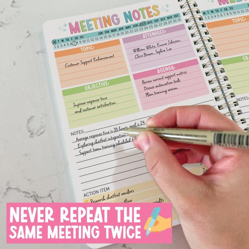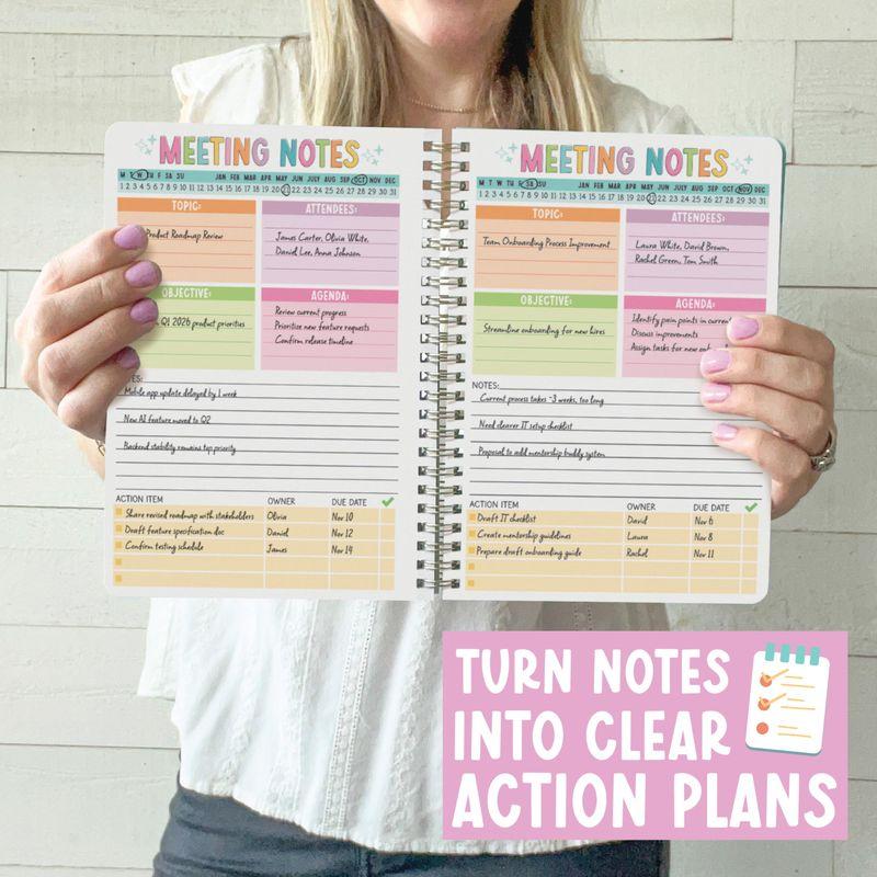 Tired of unproductive meetings? Stay organized with this professional meeting notebook. Capture agendas, objectives, notes, and action steps. No more lost or repeated tasks.