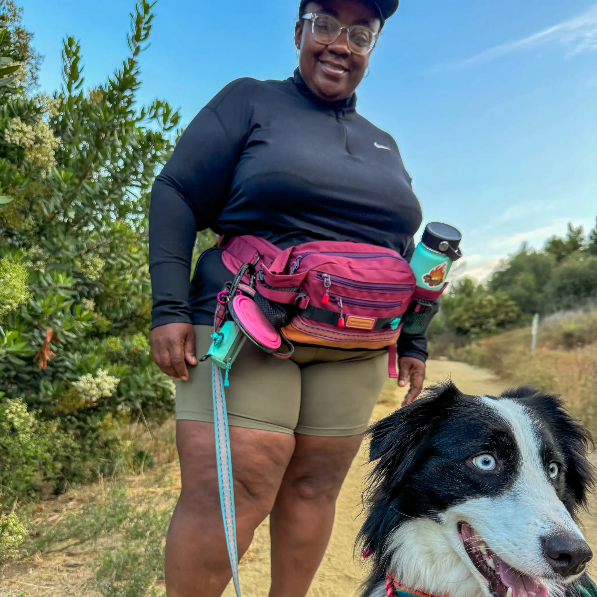My new favorite bag! I Love ***** packs, and the fact this one holds a water bottle saves me from having to bring a back pack! Plus tons of loops to clip carabiners for things like my pup’s water bowl. The padded support on the hips are a nice touch, and I can securely feed my pup’s lead through the hips strap with lots of support for hands free walks! I don’t know why I waited so long to order this bag. Green is even cuter in person!